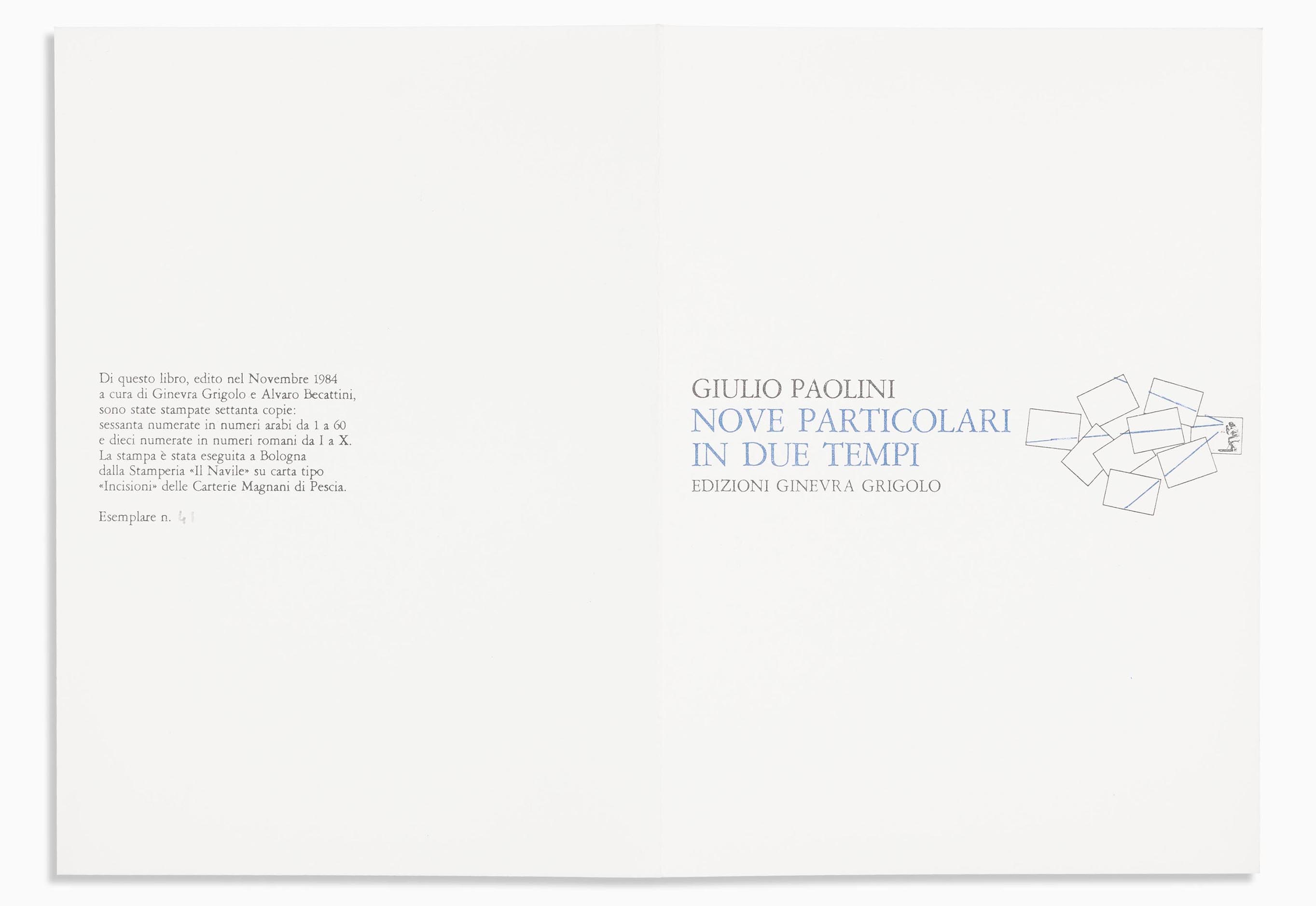 The portfolio-book was produced by Studio G7, Bologna – founded in 1973 by Ginevra Grigolo – on the occasion of the second solo exhibition of Paolini's work, inaugurated on 1 December 1984. From the very start the gallery's activity included the presentation and the production of artist's books and graphic editions.