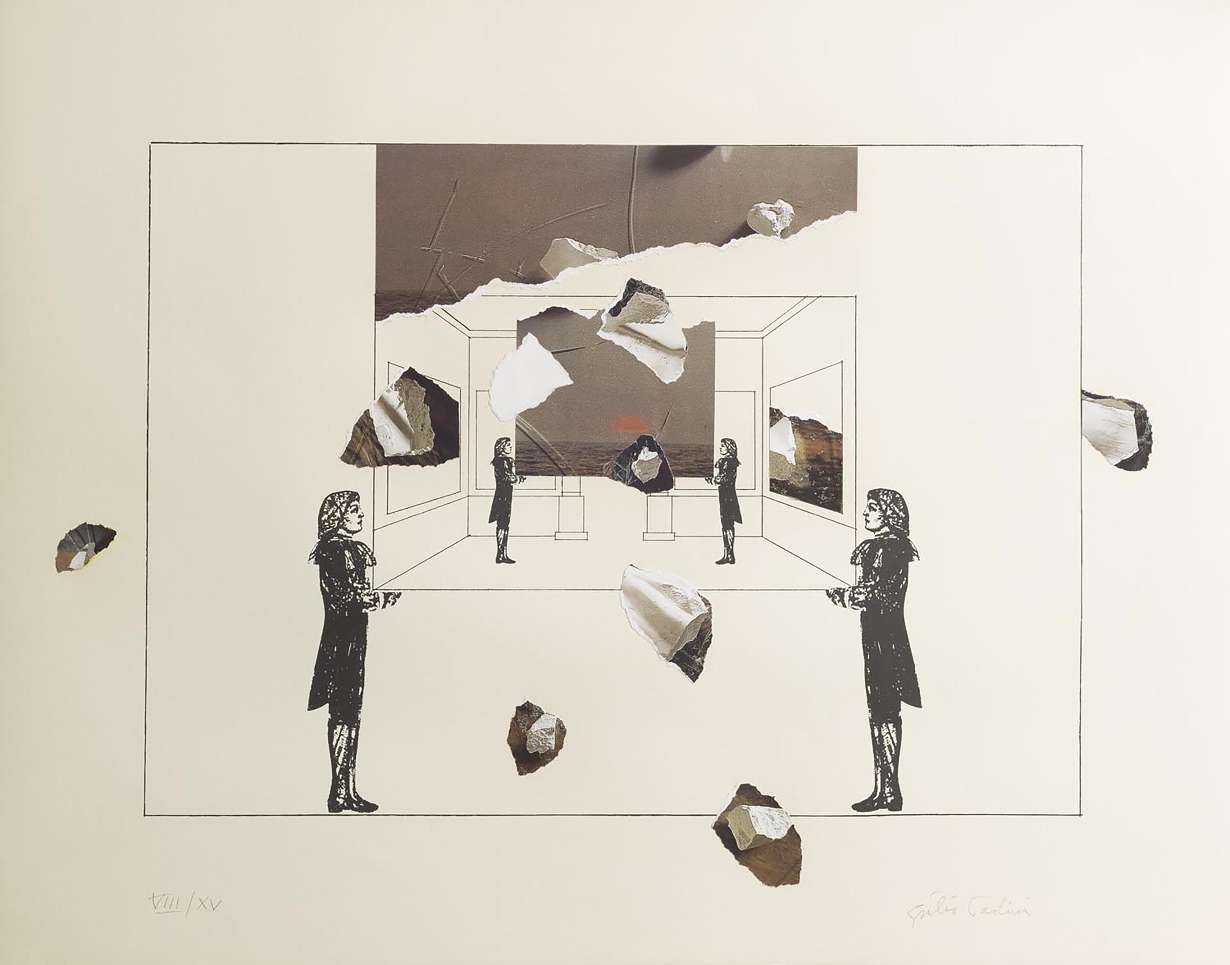 A pair of male figures in livery, contained inside a drawn rectangle, present the drawing in perspective of a room, with several paintings on the walls and a second pair of figures, identical to the first, which in turn hold a torn image of the sun setting on the sea. Other fragments of the same image of the sea and of several plaster pieces, applied with collage, are dispersed, falling randomly across the entire extension of the sheet.1