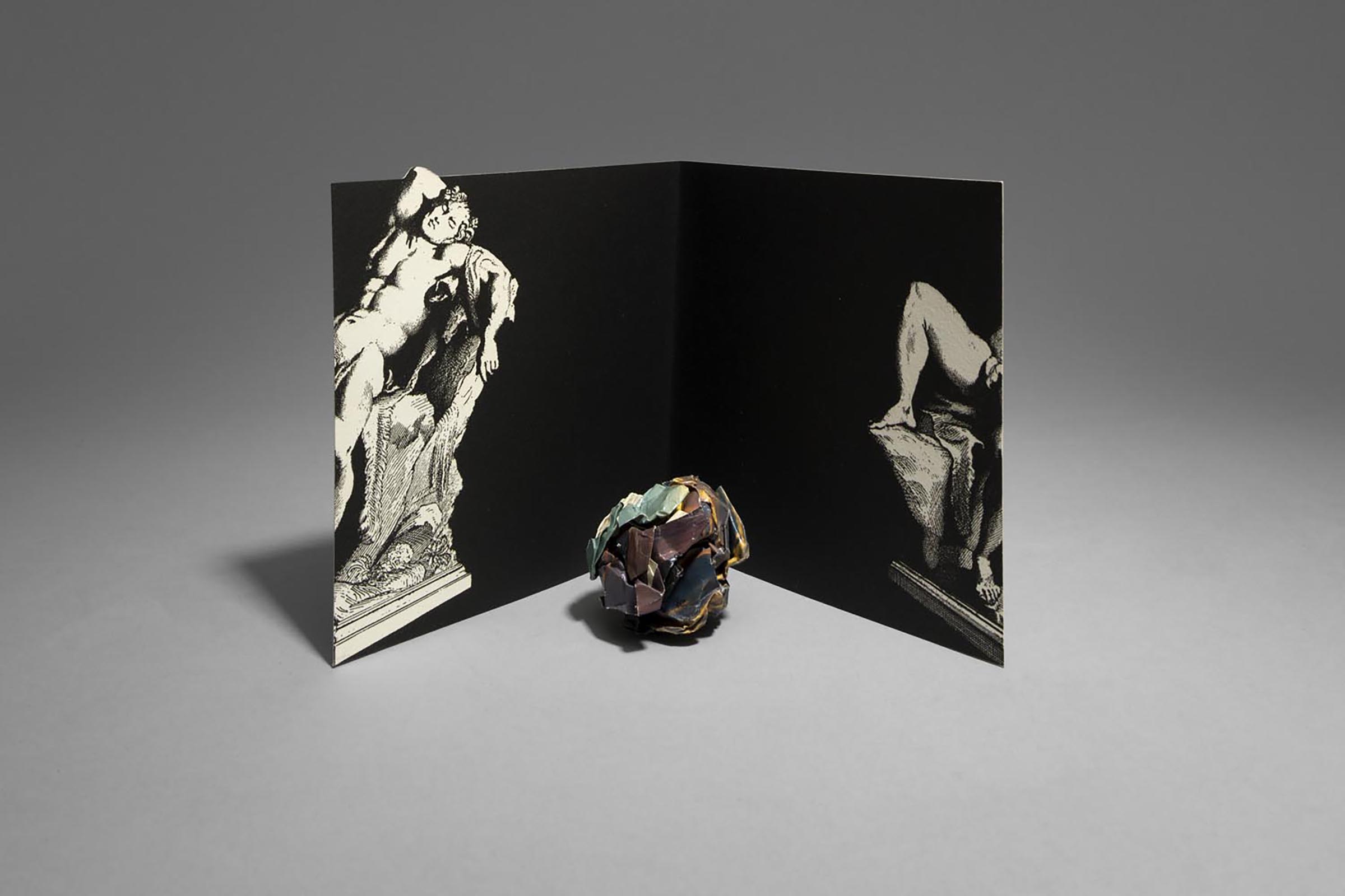 The black card folded in the middle bears the reproduction, on either end, of the two halves of a reproduction of the Barberini Faun. In the installed work, the card serves as a set design for the mysterious crumpled up image, located in the foreground in a central position.