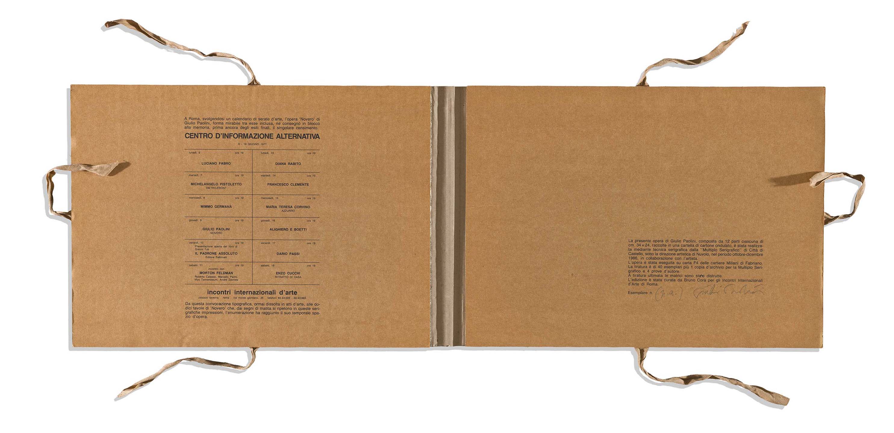 Double-sided havana corrugated cardboard folder with a spine, tied with three light brown ribbons, closed format 27 x 38 x 3 cm; on the front board titles in black (author, title, publisher). On the inside front board a reproduction of the calendar of evening events presented in June 1977 at the Centro d’informazione alternativa (Incontri internazionali d’arte), Rome, with a short explanatory note by Bruno Corà; on the inside back board, the colophon. Contains the twelve plates.