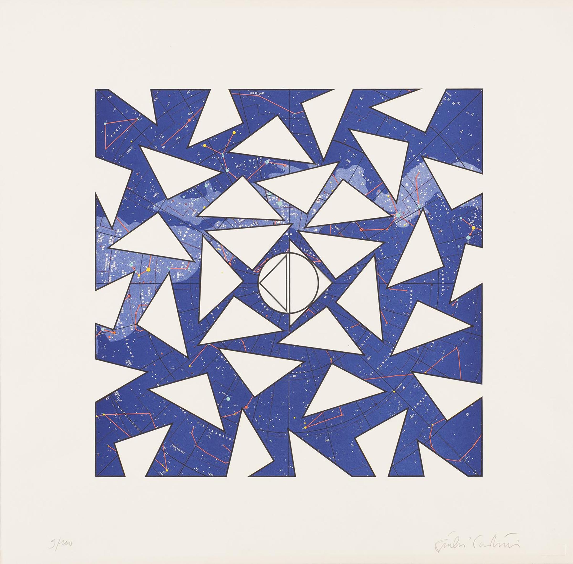 A star chart featuring the major constellations is the background to a dizzying multitude of white triangles coming from the central nucleus, consisting of the incongruous combination between two triangles and a circle.