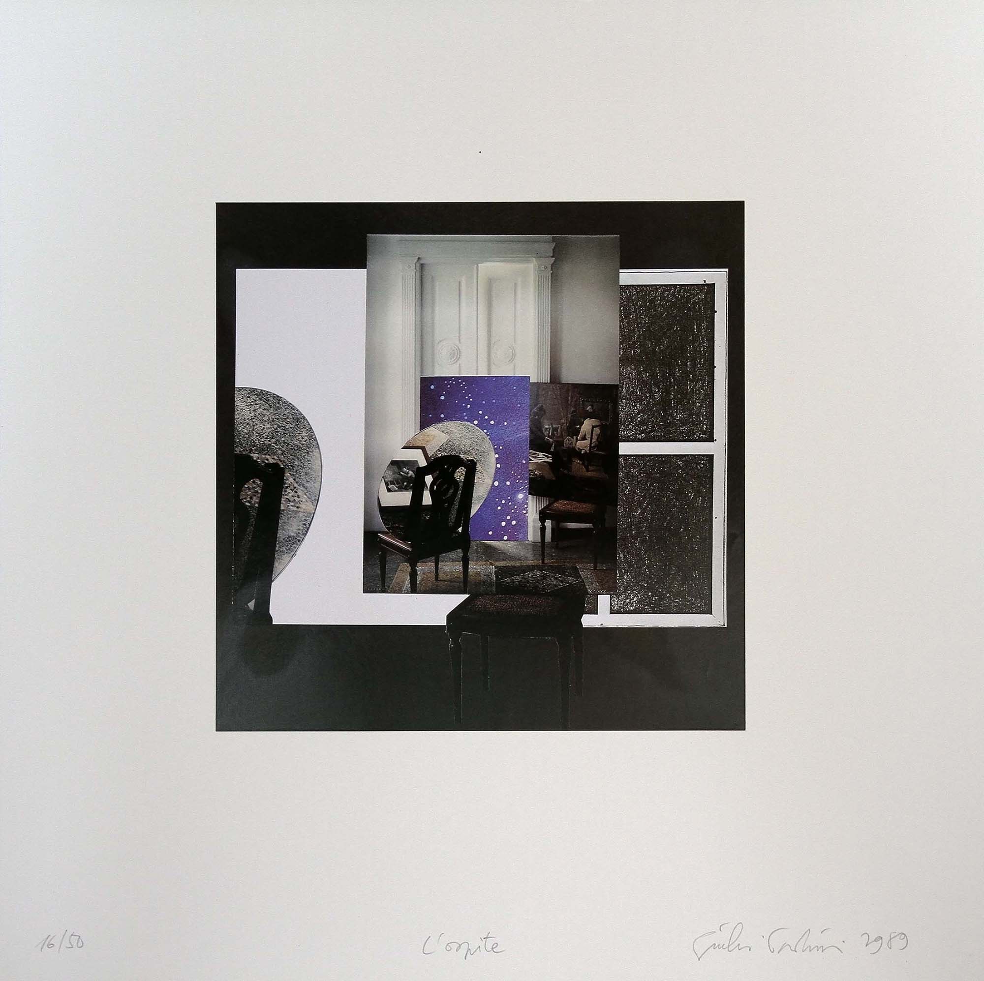 The edition is based on the image conceived for the invitation to the solo show at the Galleria Massimo Minini, Brescia, in 1989. Indeed, the iconographic theme recalls the eponymous large-scale work on display (GPO-0643). See also the variant on paper, Studio per “L’ospite”, 1989, with a cosmic background instead of a black one, documented in the online Catalogue Raisonné of the works on paper at number GPC-0769.