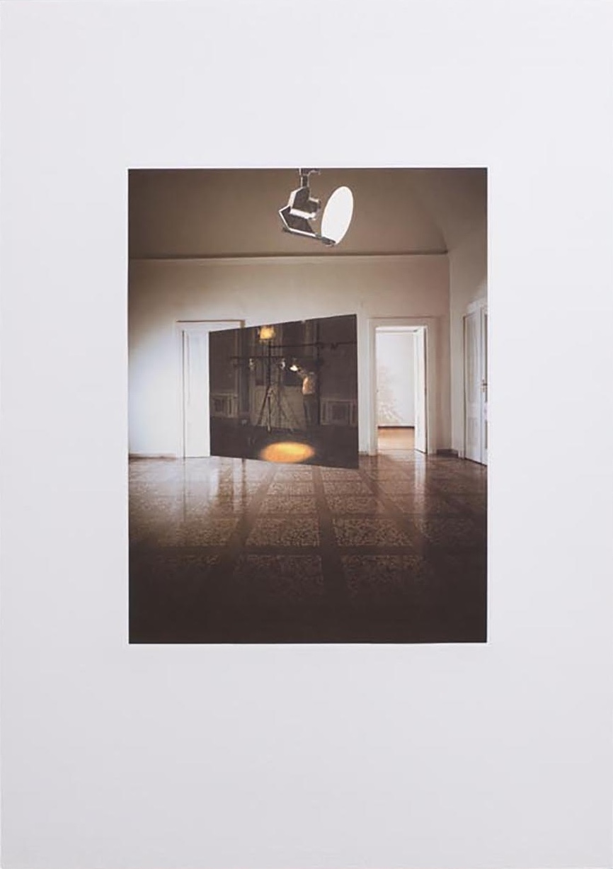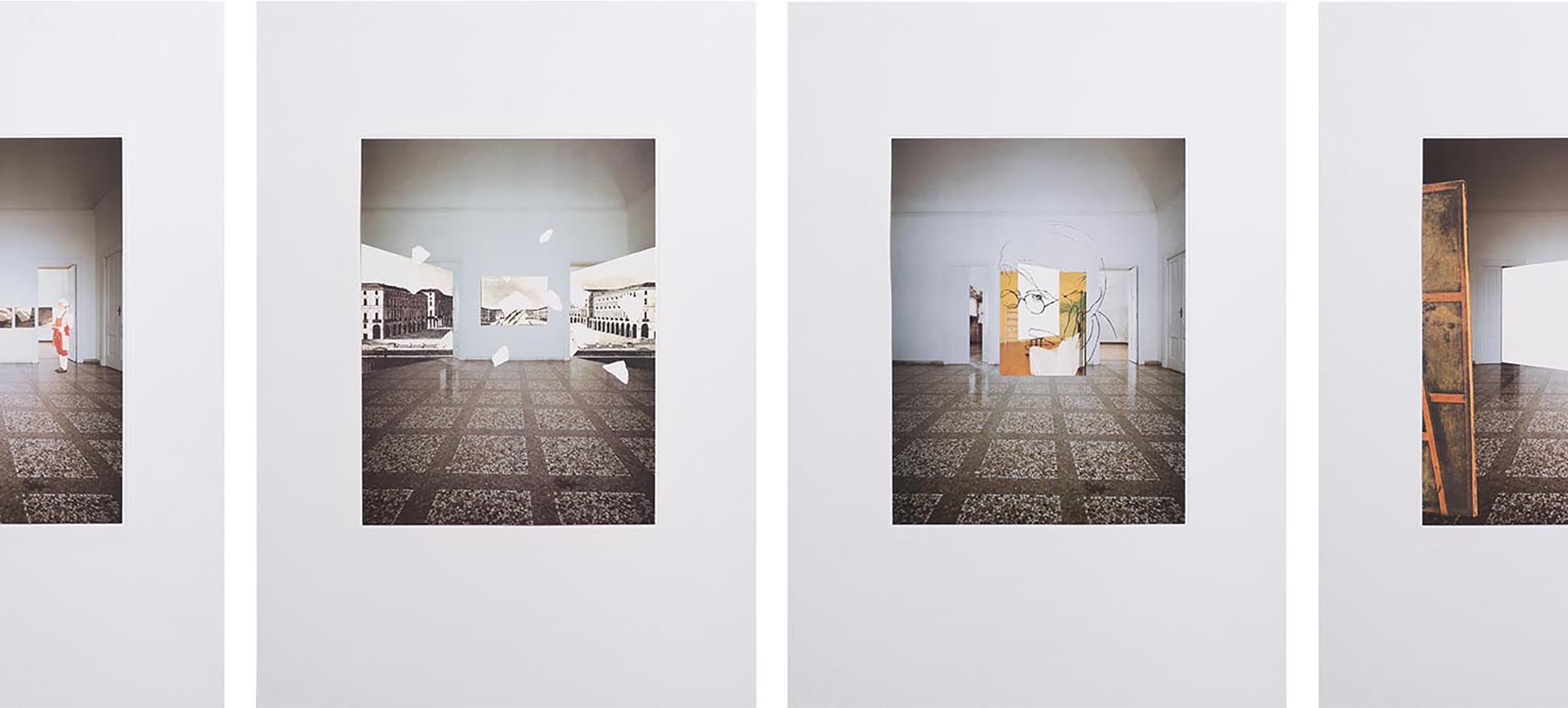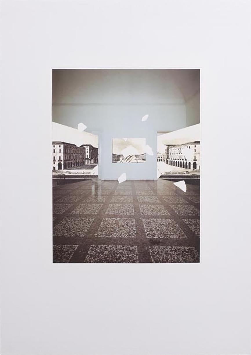 In the first plate, the model of an exhibition space, placed on a black pedestal, hosts in the background a blank surface, a painting without a face. In the second plate, a spotlight on the ceiling converses with a photograph, arranged diagonally, that reproduces a photographer intent on arranging the lights of a photographic set. In the third plate, a pair of valets wearing theatre costumes holds seven photographic details (as many as the plates in the folder itself) of plaster fragments.1 In the fourth plate, an ancient view of Piazza Vittorio Veneto in Turin (overlooked by Paolini's home) serves as a backdrop, while at the centre, in the area corresponding to the vanishing point of the perspective, a hand holds a blank sheet that is dispersed in fragments, scattered on this side of the illusory view of the city. In the fourth plate, a drawn self-portrait of the artist, with a drawing pin in the area corresponding to the left eye, overlaps the image of a blank canvas, set down on an easel, thus alluding to the role of the "guest" assumed by the author before the work of art.2 In the sixth plate, the verso of the painting that in Las Meninas (1656) by Diego Velázquez the painter is intent on painting is offset by a blank canvas, which reflects the unknown identity of the painting hidden from our gaze.3 Lastly, the seventh plate features the image of a large modular metal structure,4 inside which a reflector is turned towards a copy of the photograph itself of the entrance hall in Paolini's home.