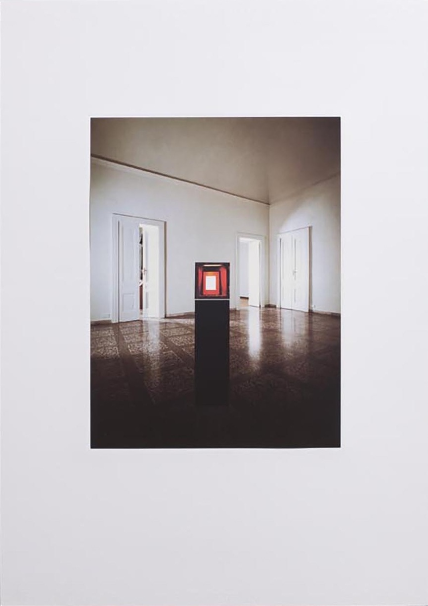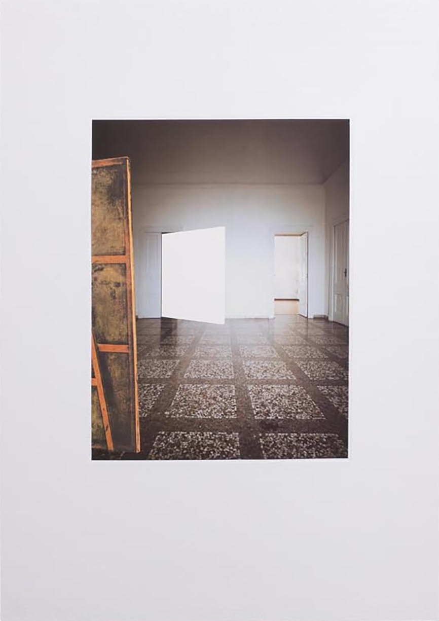 The print edition is part of the main work theme of 1991, based on the drawing and on the photographic reproduction of Paolini's home, with two doors at the rear.5 The Latin expression in the title (”behold thus”– borrowed from the poem De rerum natura (1st century BC) by the Roman philosopher and poet Titus Lucretius Carus – recalls the lines in which our gaze is invited to contemplate the movement of the atoms in the bundle of light of several sunbeams filtering into a dark room.6 In the prints, the invitation to observe is translated into the mise-en-scène of episodes announcing to the gazer hypothetical images, ones still without an identity, inviting him to wait. Hence, the exit from the stage of the author, who privileges the role of the viewer, the emphasis on the visual act, the direction of the spotlights on the space of the representation, the use of perspective and trompe-l’œil as devices of the gaze, the blank canvas as the projection screen of any image possible, the modular structure as the potential container of all the works imaginable.