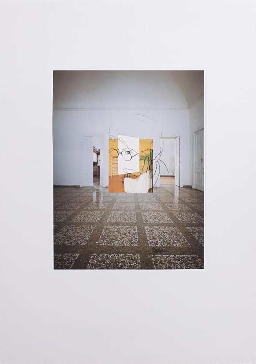 2 The image reproduces the artist's work titled L’ospite, 1986 (GPO-0569). The drawn face, outlined after a portrait taken by the photographer Gérard Amséllem in 1983, is also corroborated in two other prints from 1991 (GPE-0081, GPE-0082).