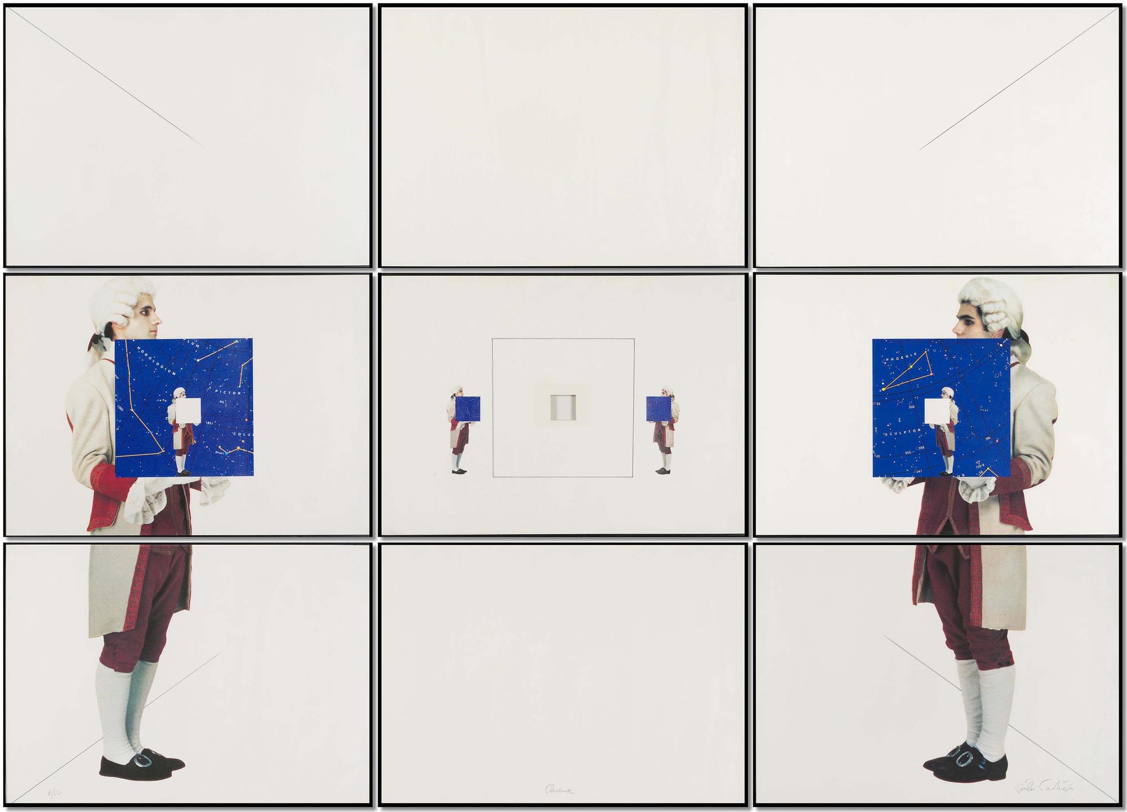The nine silkscreens arranged to resemble a large painting reproduce, in the foreground, to the sides, two valets wearing theatre costumes, each of which holding a square image, representing a detail of an astronomical map.1 The two squares are aligned with a third square of the same size, which is empty and outlined in the middle plate. In the background, two other pairs of valets, proportionally reduced and aligned with each other, double the same scene. The first pair stands out inside the two astronomical squares and holds a small white square; the second pair is located in the central plate, and also holds the detail of a star chart. At the centre of this sequence of valets – as well as at the centre of the entire composition – is a small cut-out square.