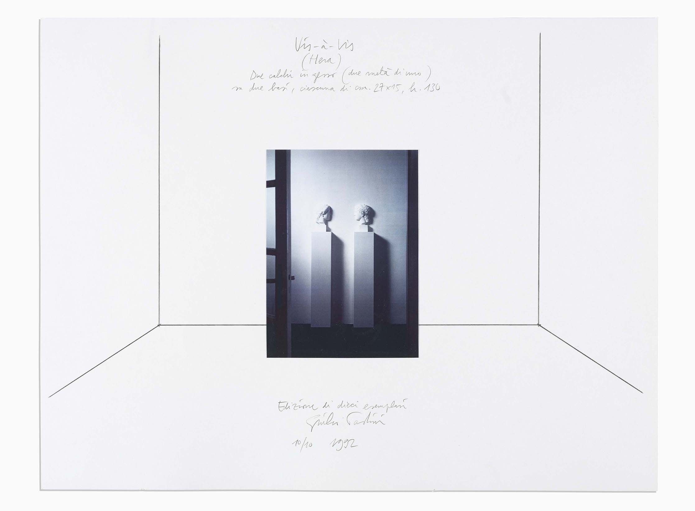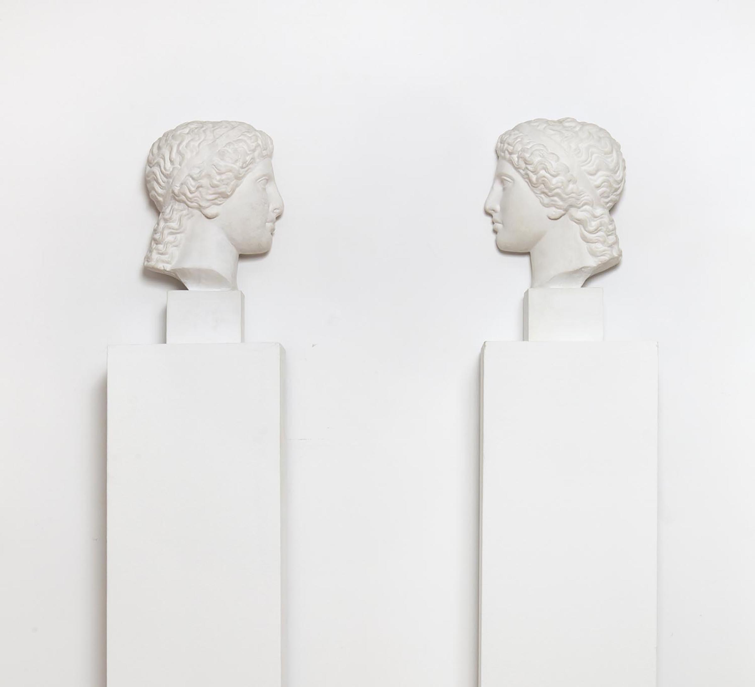 The two halves of the plaster cast of a classical head of Hera face one another – vis-à-vis as the title tells us – on two plinths up against the wall.