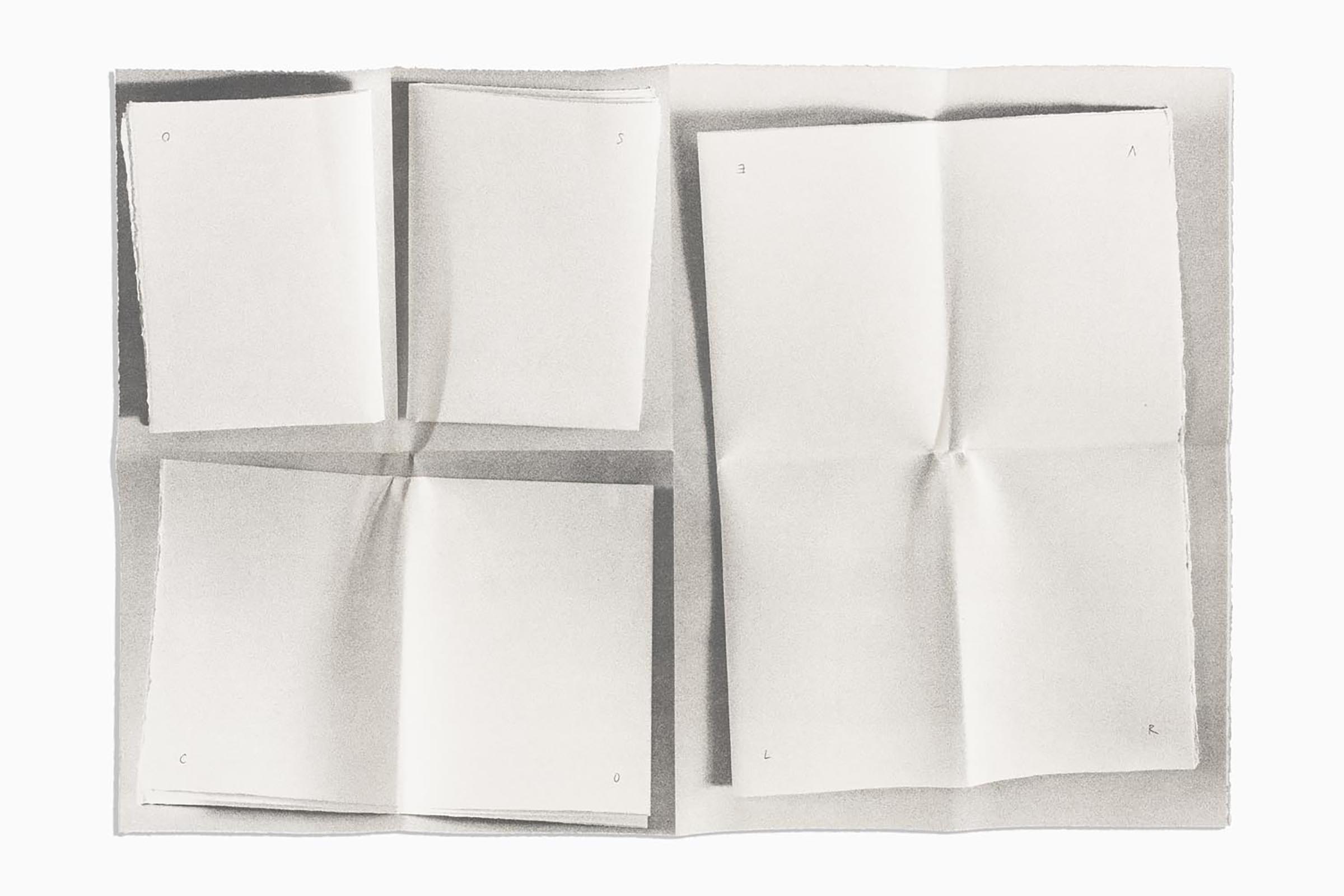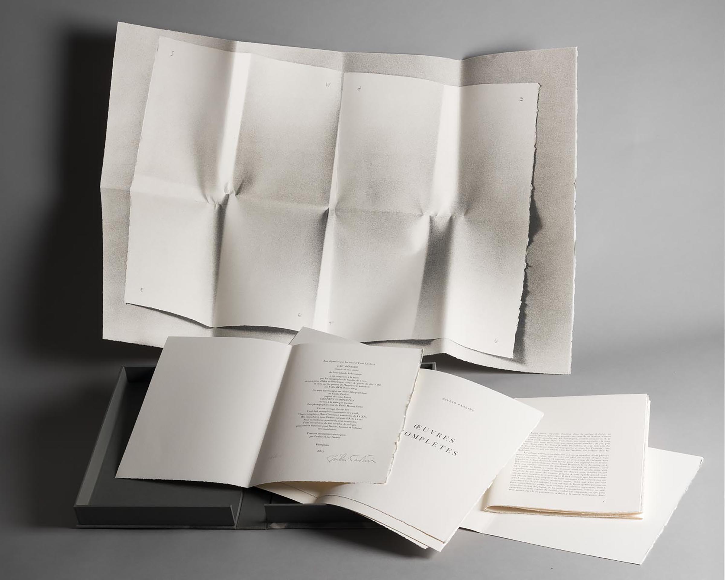 The book/multiple includes two large-format sheets folded into quarters, with one featuring a text by Jean-Claude Lebensztejn1 and the other a contribution by Giulio Paolini. Paolini's sheet reproduces several photographs of the same white sheet at different moments of its folding, so that by opening and closing the sheet, the sides and folds that are leafed through are gradually reproduced.2 In addition, each side on the photographic sheet bears the inscription of one of the letters in the title, in autograph calligraphy, in one of the two lower corners. That way, their reading, in the order of the pages of the folded sheet to make up an untouched sixteenth, traces each of the sixteen parts of the sheet. In the artist's words: "The sixteen letters of the title mark, one by one, the sixteen parts of a sheet that, folded precisely in 'sixteenths,' evokes the 'text' of the pages that is thus constituted."3