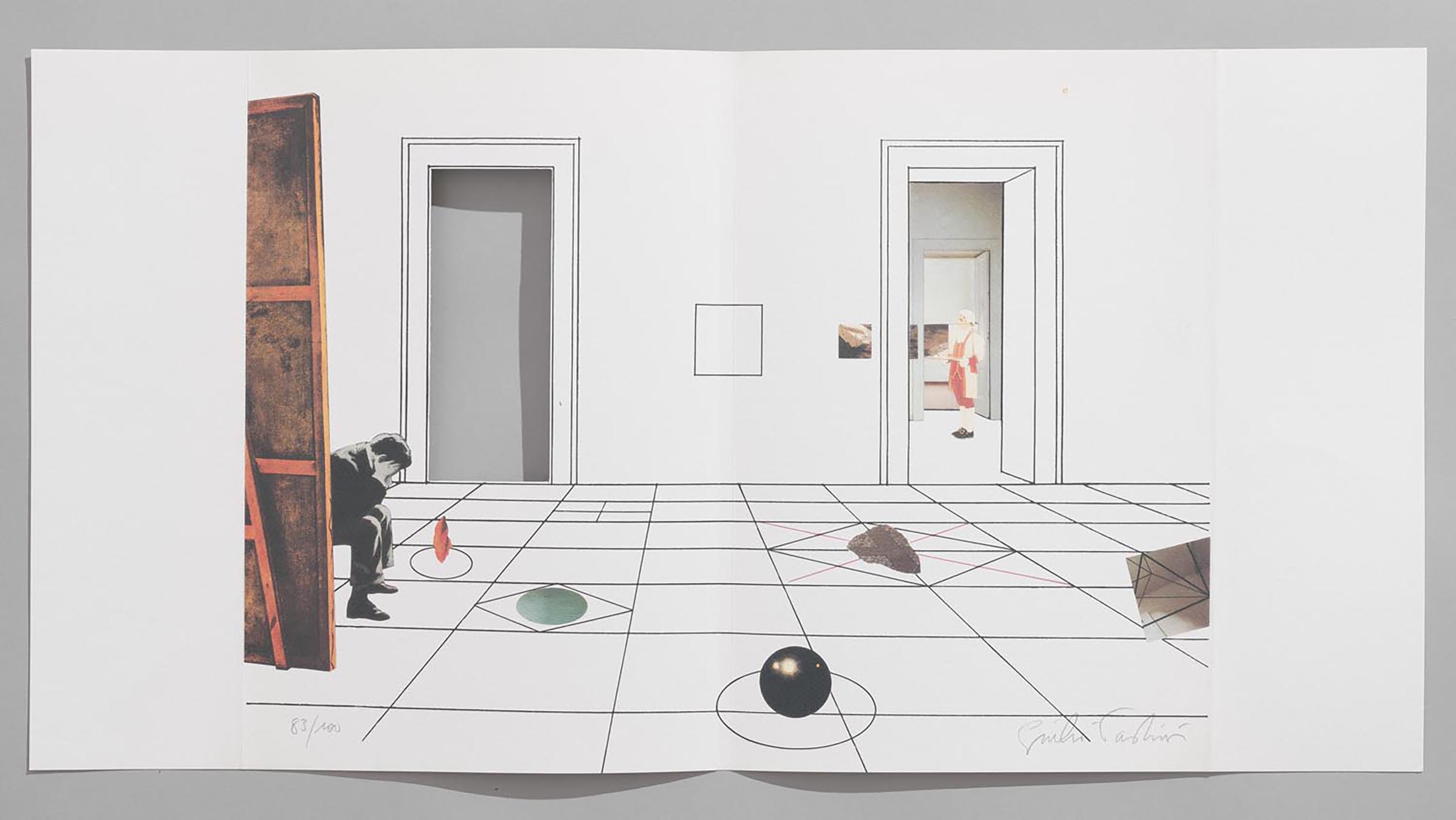 3 The detail of the floor is from the photograph of the floor in the same entrance hall in Paolini's home, while the rectangle with the red diagonals recalls Disegno geometrico, 1960; for the volumetric structure see the seventh plate in the portfolio Contemplator enim (GPE-0080).
