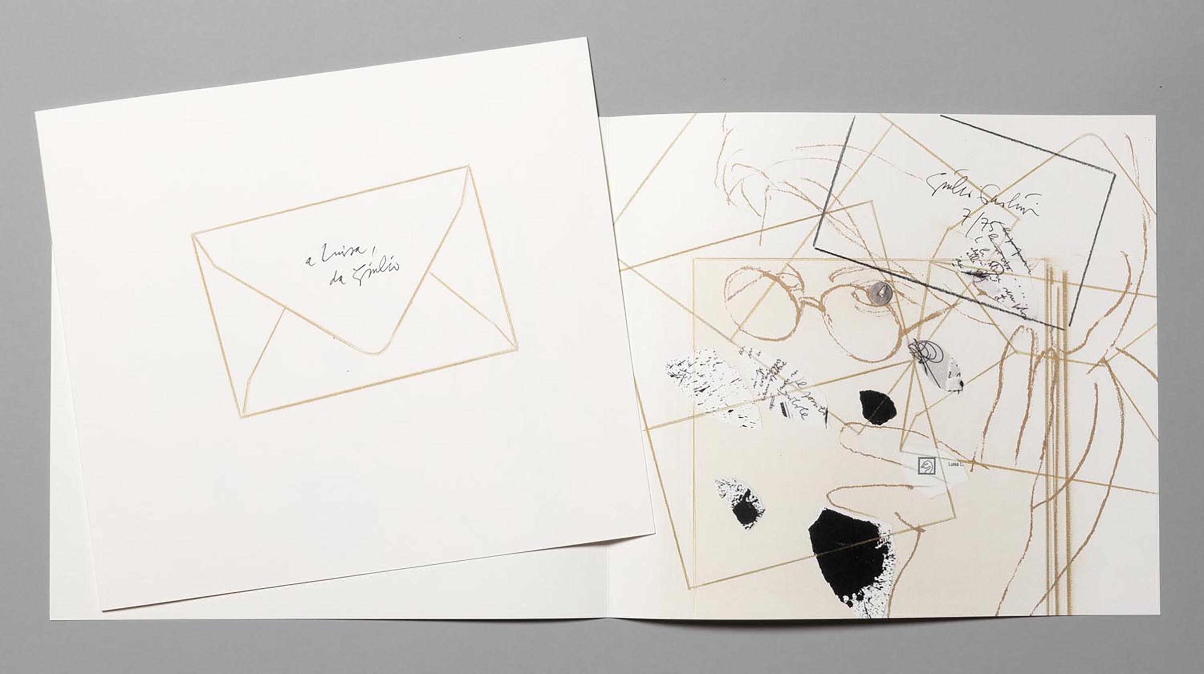 The print is made up of a sheet folded in half, which when closed reproduces the gold-coloured drawing of a closed envelope featuring the handwritten dedication repeated in the title (“to Luisa, from Giulio”).1 When it is open, the print features on the right side, full-bleed, a drawn self-portrait of the artist that overlaps several blank sheets, held down by a drawing pin in the same location as the left eye of the face.2 Overlapping the self-portrait is the drawing of an open envelope and two sheets (they too open, as suggested by the midline), as well as several fragments of writings by the artist, the logo for the Galleria dell’Oca (founded and directed in Rome by Luisa Laureati), and the details of an ink stain (borrowed from La Sainte Vierge II, 1920, by Francis Picabia). A rectangle outlined in pencil, in a variable position from one copy to another of the edition size, includes the signature and numbering.