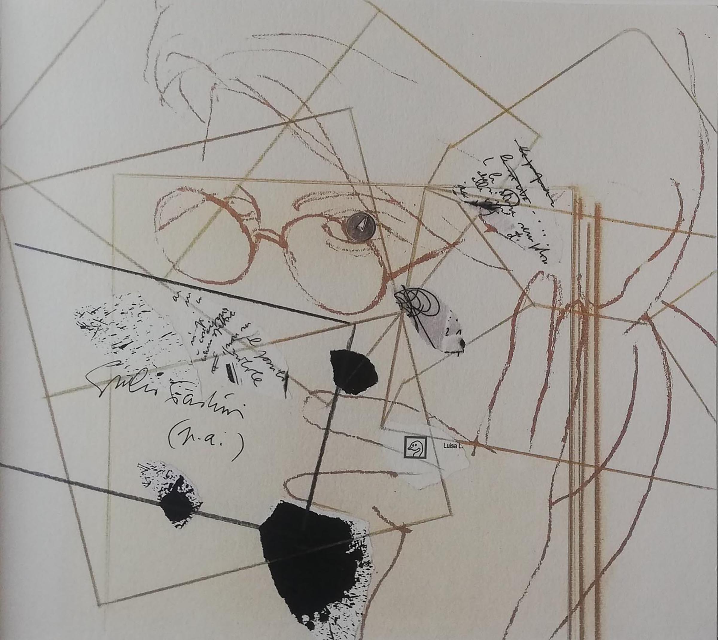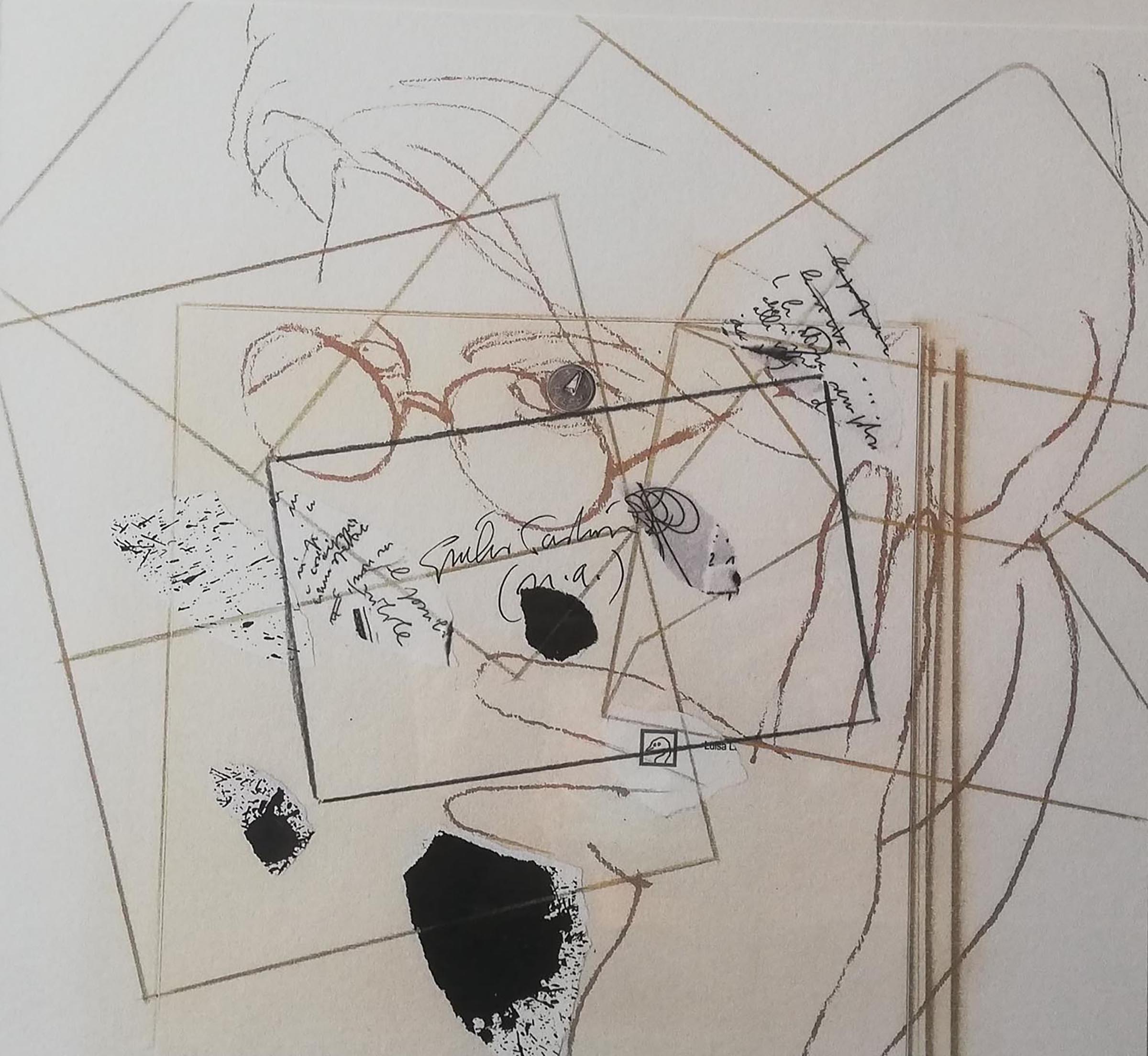 All the elements at play recall the context in which the print was made: Paolini and Laureati as the interlocutors of the exchange of letters and of the images published in the book; the envelope, the fragments of writing, and the ink stain as motifs linked to the correspondence and to writing.