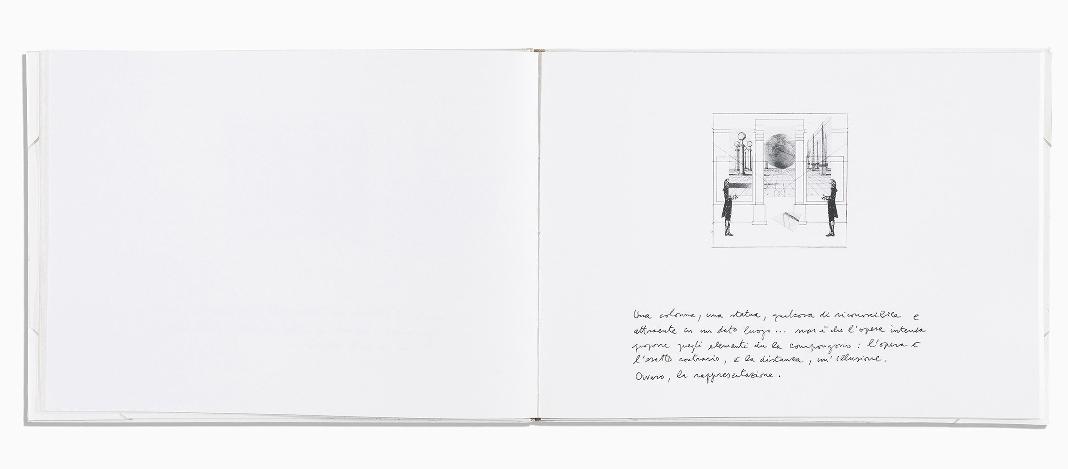 Ten short unpublished texts by the artist, in handwritten calligraphy and accompanied by the same number of drawings, concerning the use of perspective in his work, as an expedient that calls into play and observes from a distance the very idea of representation.