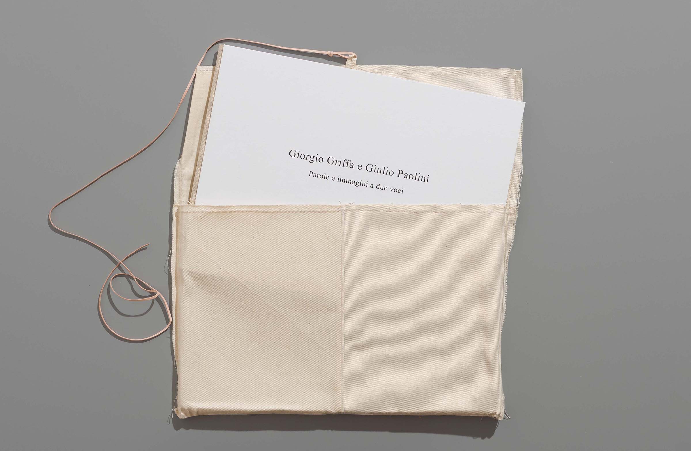 Giorgio Griffa, Giulio Paolini, Parole e immagini a due voci, Colophonarte, Belluno 2023. 40 x 30 cm, 104 pages, bound. Letters between the authors, texts and drawings by the authors. Print run 65 copies in Arabic numerals, 30 in Roman numerals, and 5 ad personam; the first 40 copies in Arabic numerals, the copies in Roman numerals, and the copies ad personam, inserted in a natural canvas case tied with leather strings, include one print by Paolini and one by Griffa, inserted in the boards, respectively, front and back between four triangular pockets.