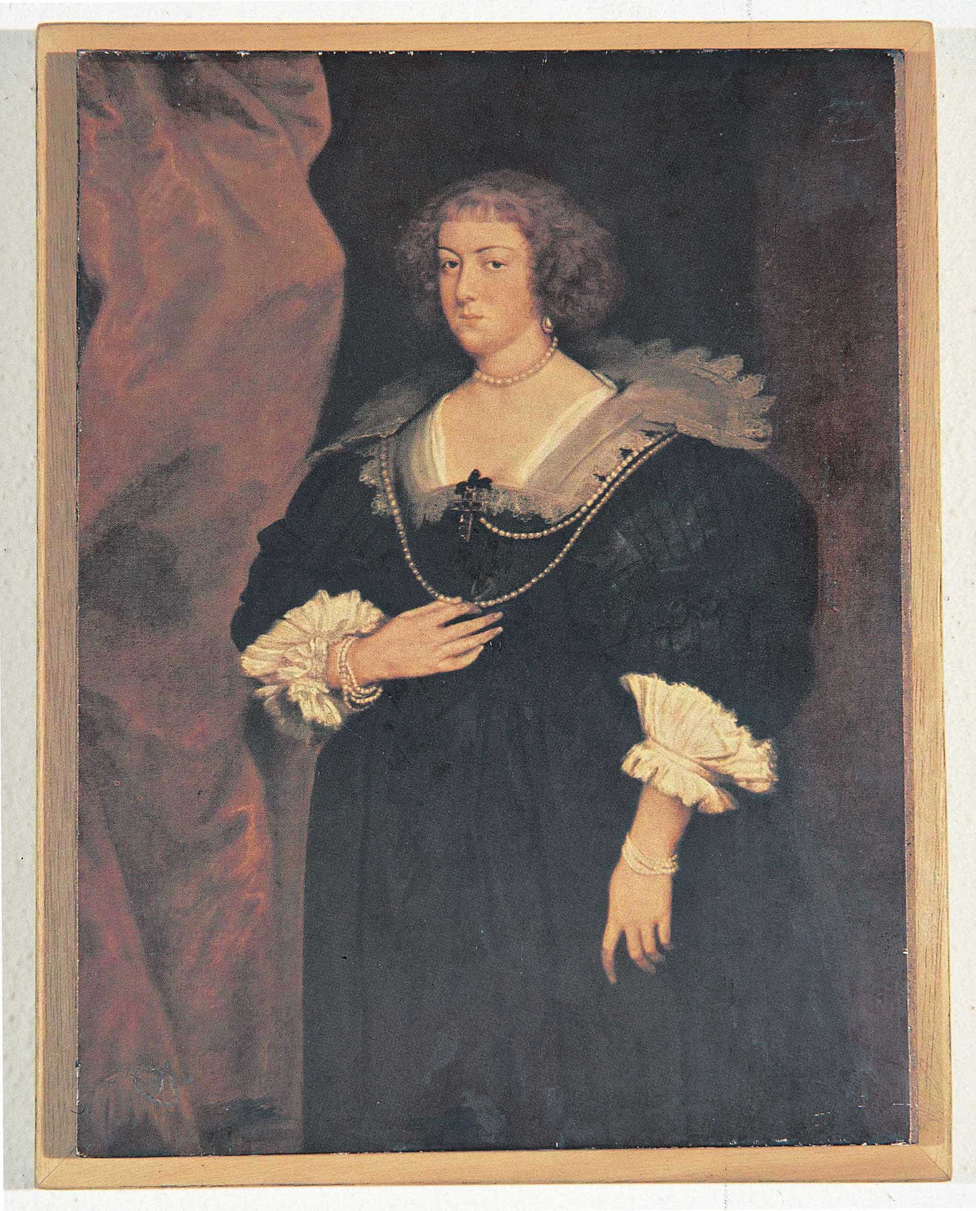 A colour reproduction of Portrait of a Lady (ca. 1635) by Antoon van Dyck is mounted on a masonite support with adhesives on the back so that it protrudes from the stretcher that is just slightly wider. On the verso is the beginning of a title taken from a magazine.