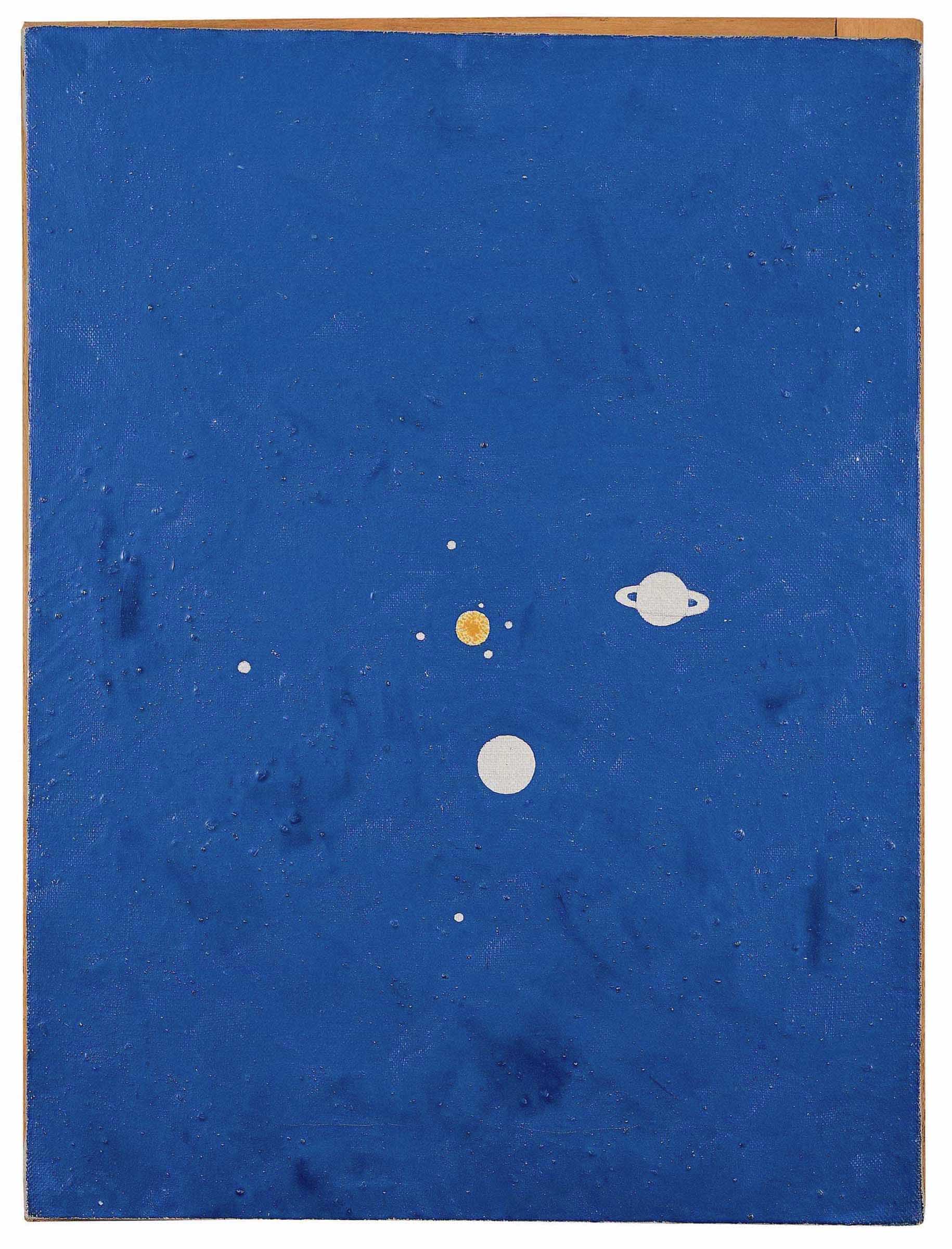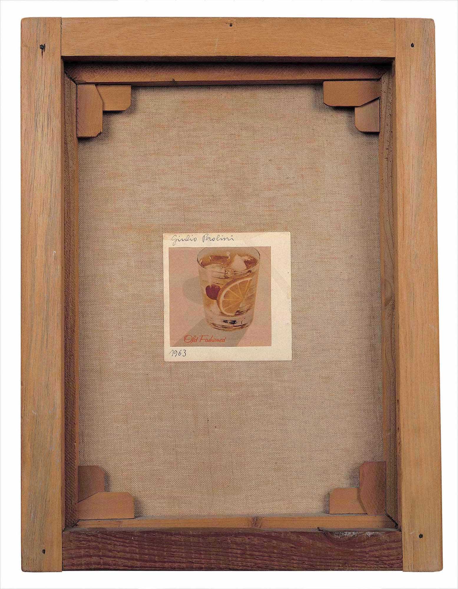 A canvas depicting the solar system is mounted on a stretcher that is just slightly larger; moreover, the adhesives on the verso make the canvas protrudes slightly from the stretcher. The Sun painted by the artist with the colour orange, in a central position, stands out against the blue background, while the other planets, isolated in negative, reveal the unprimed canvas. On the back is an image from an advert for a cocktail accompanied by the name "Old Fashioned". Old Fashioned is part of a group of works (from GPO-0028 to GPO-0049) whose common denominator is the presence of an intervention on both the recto and the verso of the painting. Surfaces of various types take turns appearing on the recto (painted paper, graph paper, photographic reproductions, shaped wooden panels), while on the verso (hidden from view) we find the details of images and printed words taken from magazines or from books. The title, when specified, refers to a textual element present on the verso. The artist explains that: “Just as on the surface various elements alternate among themselves, but always remain ‘blind’, in the sense that they tend not to supply an image, but are there for their own sake, occupying that given space, so the title itself is absolutely autonomous with respect to the surface [...], constituted by a fragment of words and, at times, images, following the signature and the date, on a white paper square on the back of the picture” (1972).1