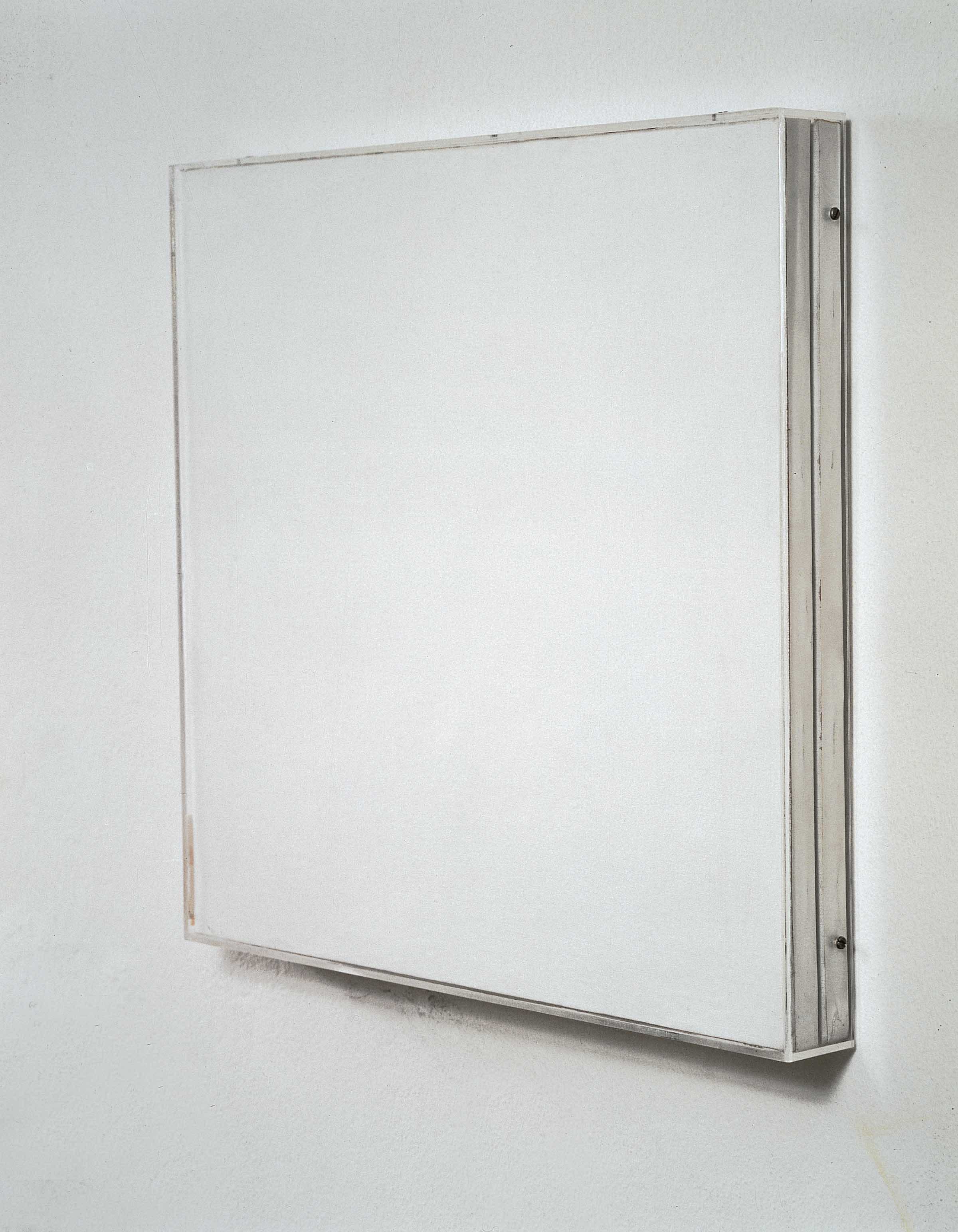 “Two primed canvases are mounted one atop the other, as if the conventional support used for a painting – the blank canvas – could only present, rather than an image, the pure acknowledgement of its existence: instead of exhausting itself in the definition of an image, the canvas tends to renew itself via its own repetition”,1 according to the artist, in retrospect.
