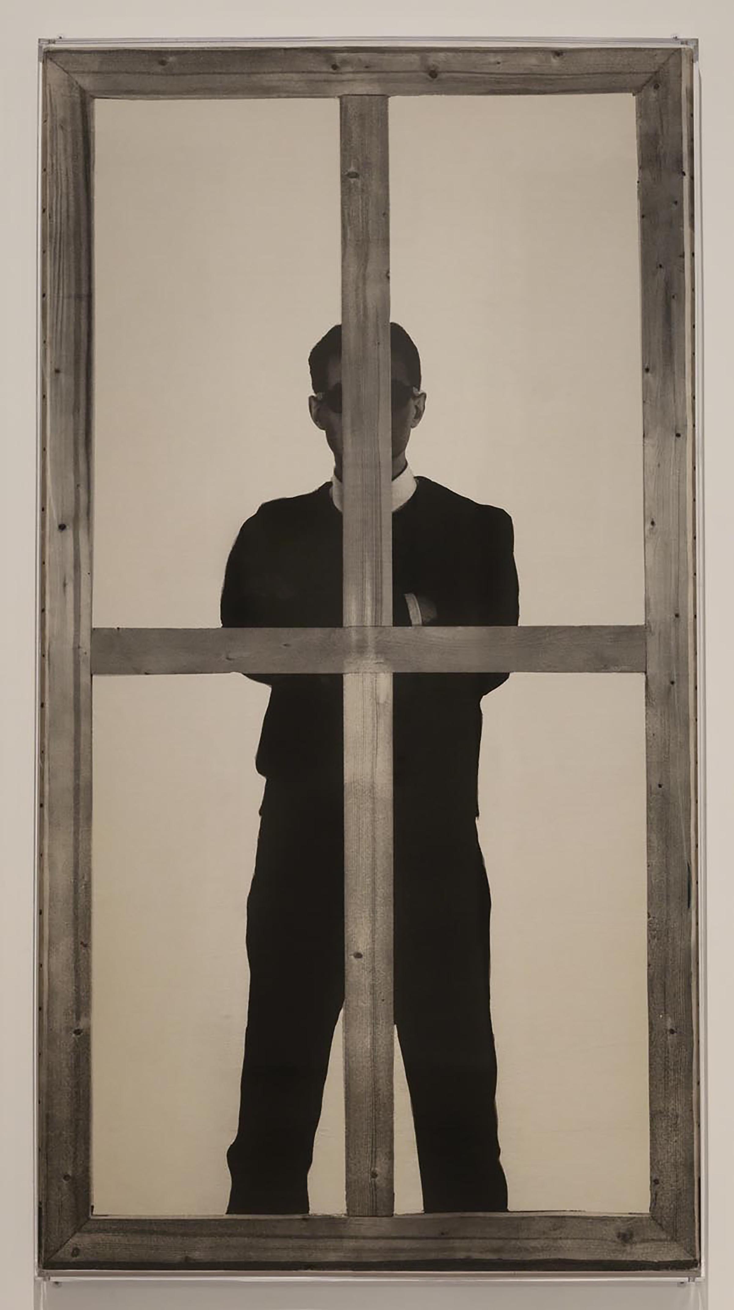 The front view photograph of the artist, partially concealed behind a stretcher, with his arms folded and wearing a pair of dark sunglasses, is printed on an emulsified canvas mounted on the same stretcher used for the photograph.