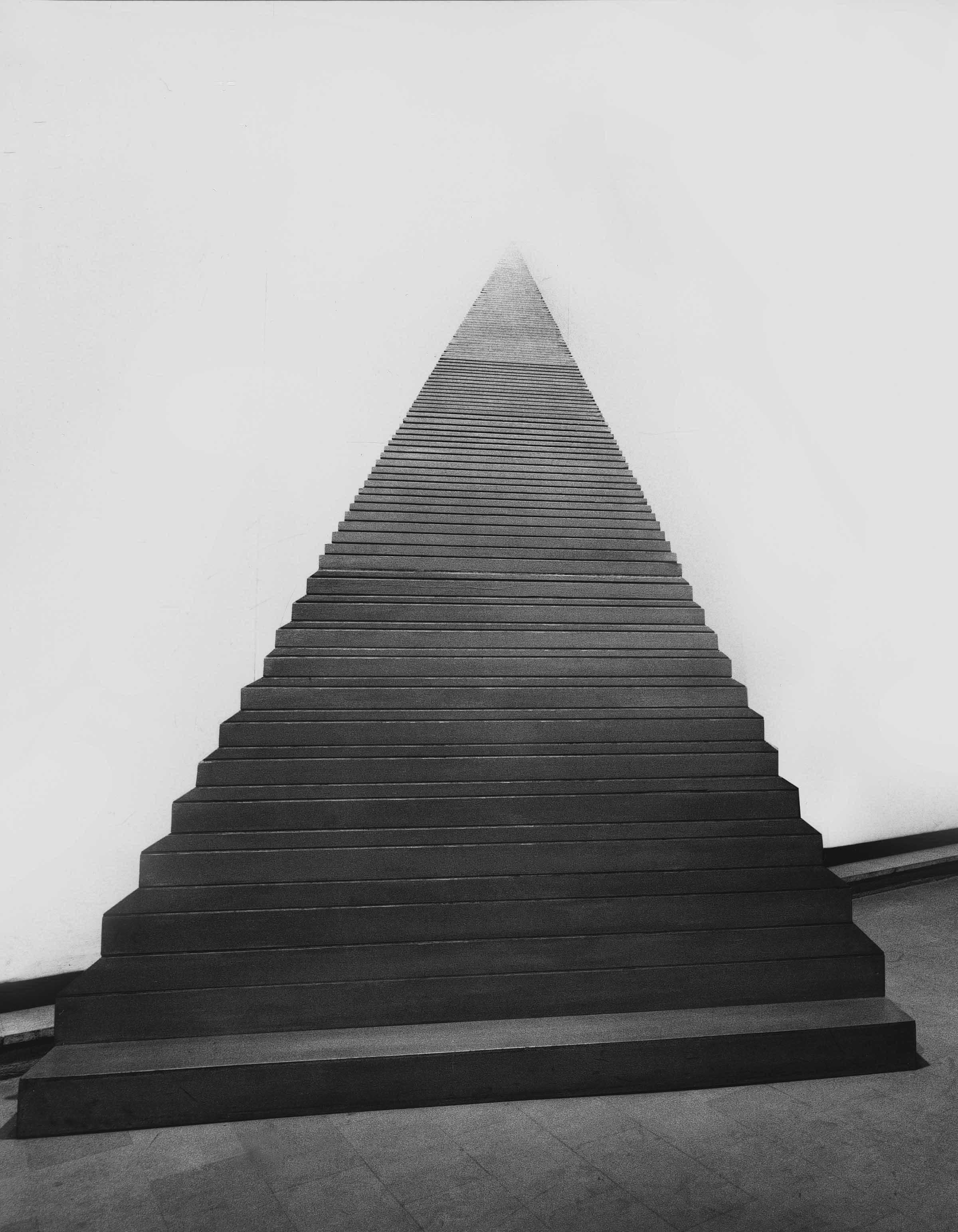 The pyramid shape, painted in silver enamel on both sides and carved to look as though it has steps, simulates a perspective towards infinity, where the progressive loss of the depth of the steps upwards reproduces the gradual diminishment of the visibility of a fixed point at an infinite distance. At the same time, the profile of the work devoted to Jorge Luis Borges replicates that of an optical pyramid.