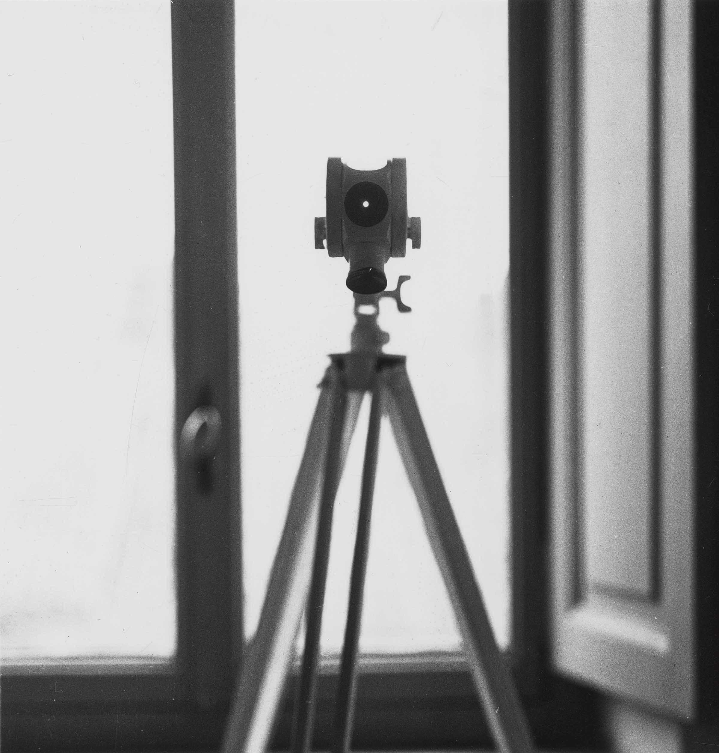 A white-painted telescope placed before a window orients the gaze towards the horizon.