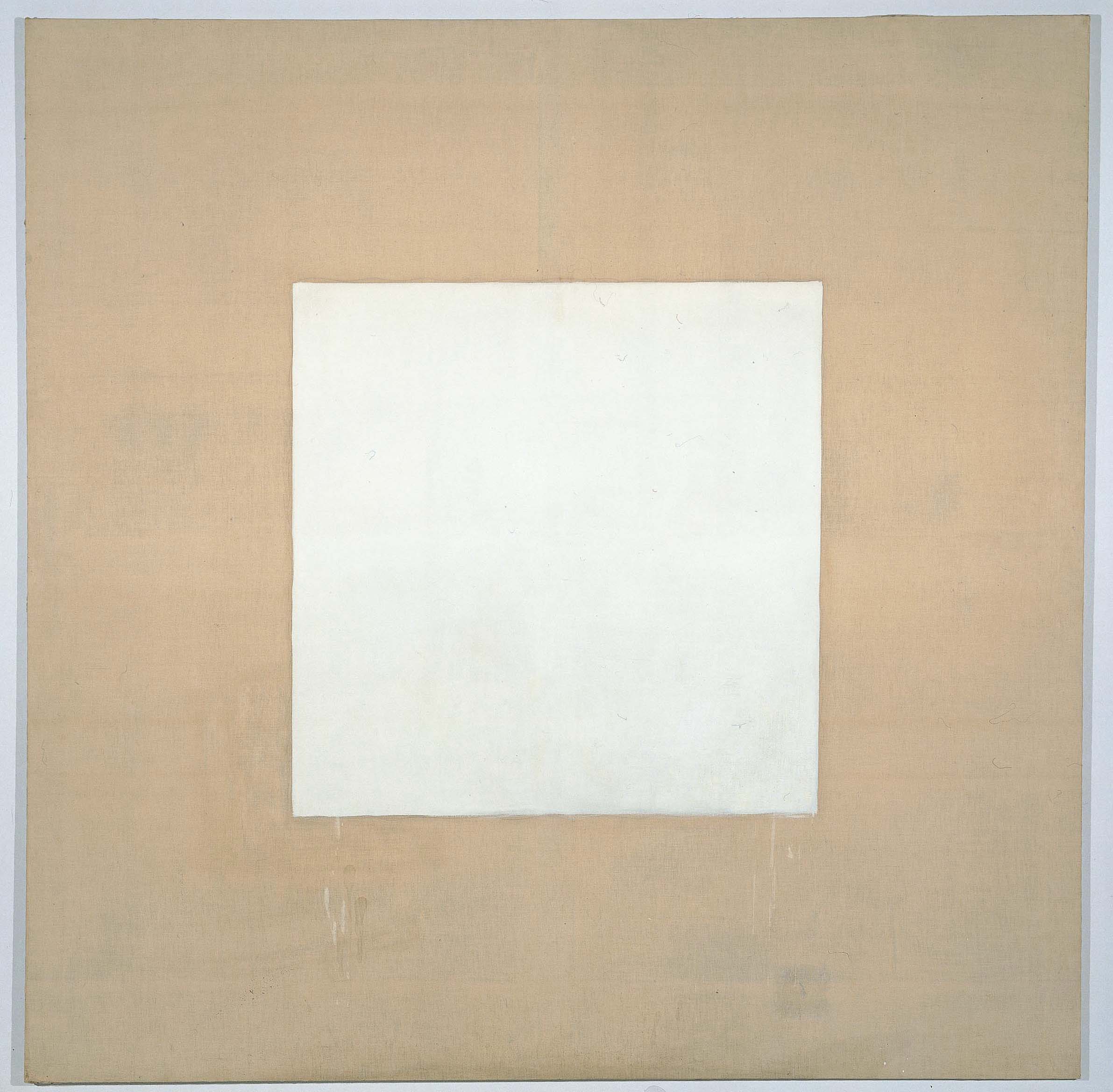 At the centre of an unprimed canvas a hectograph pencil is used to outline a square painted with white tempera, whose dimensions correspond to half of those of the canvas. The slightly irregular pattern of the outline made by the pencil “copies” the edges of the canvas, thus calling into question the relationship between the painted surface and the canvas containing it.
