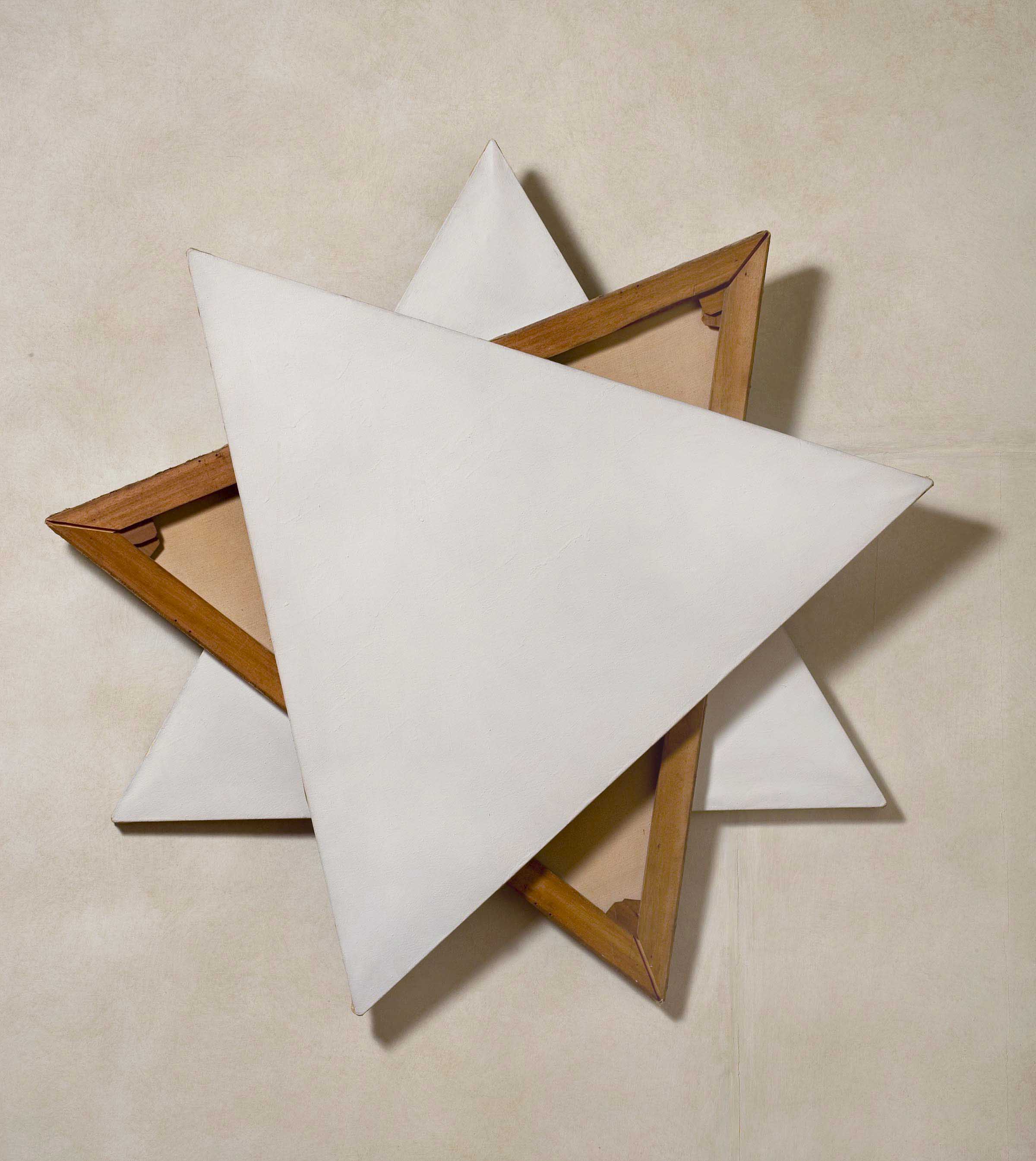 Three equilateral triangular canvases placed one on top of the other and turned so that they form a star – the first and third seen from the recto, the one in the middle from the verso – pursue each other in the vain attempt to find an ideal correspondence.