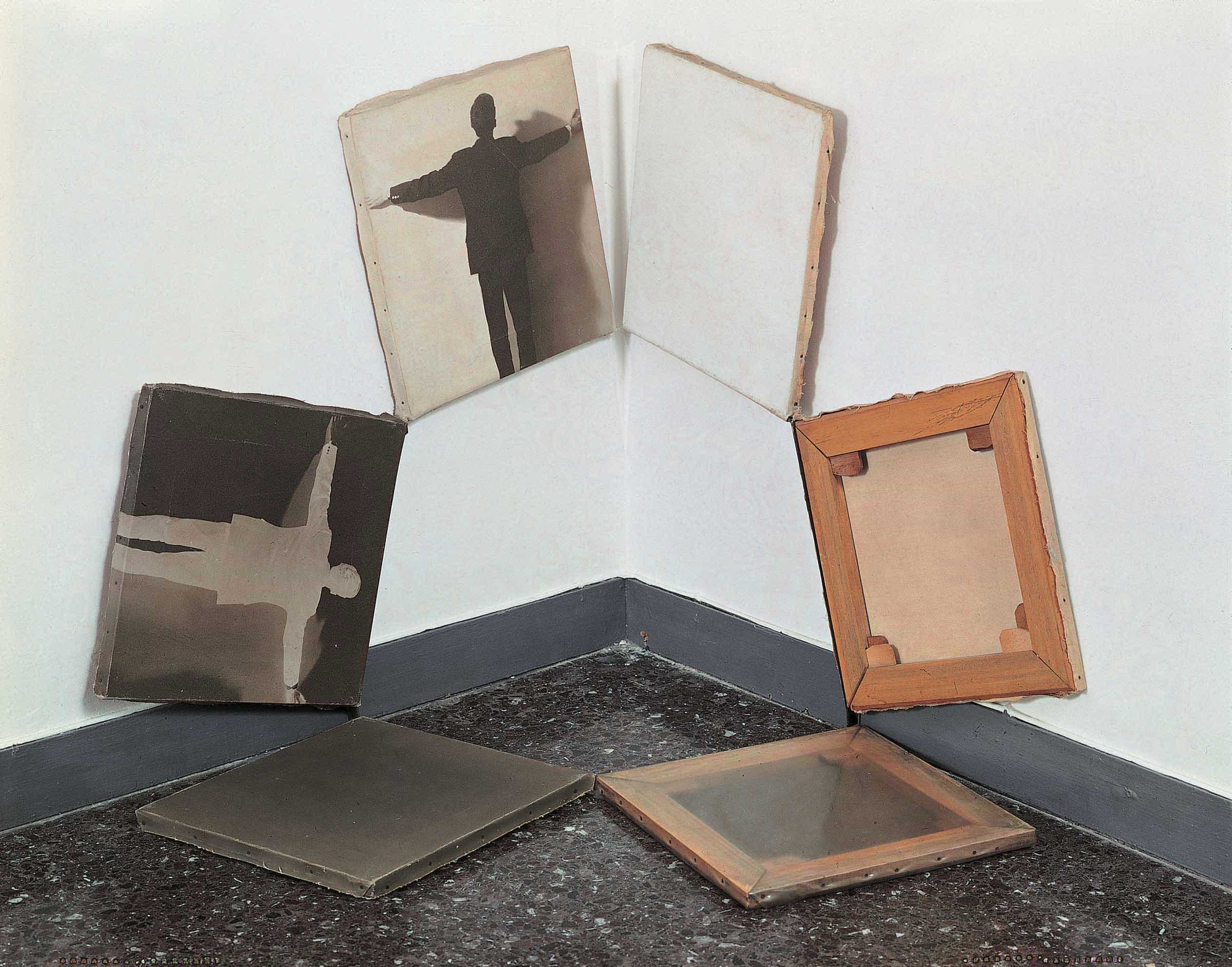 Six elements arranged in a circle in the corner of a room constitute the succession, in a complementary manner and clockwise of: a photographic canvas with an image of the artist holding a blank canvas,1 a blank canvas, an overturned canvas, a sheet of polyethylene stretched over a stretcher, a monochrome photographic canvas in sepia, and, lastly, an overturned photographic canvas that reproduces the initial image but in its negative version.