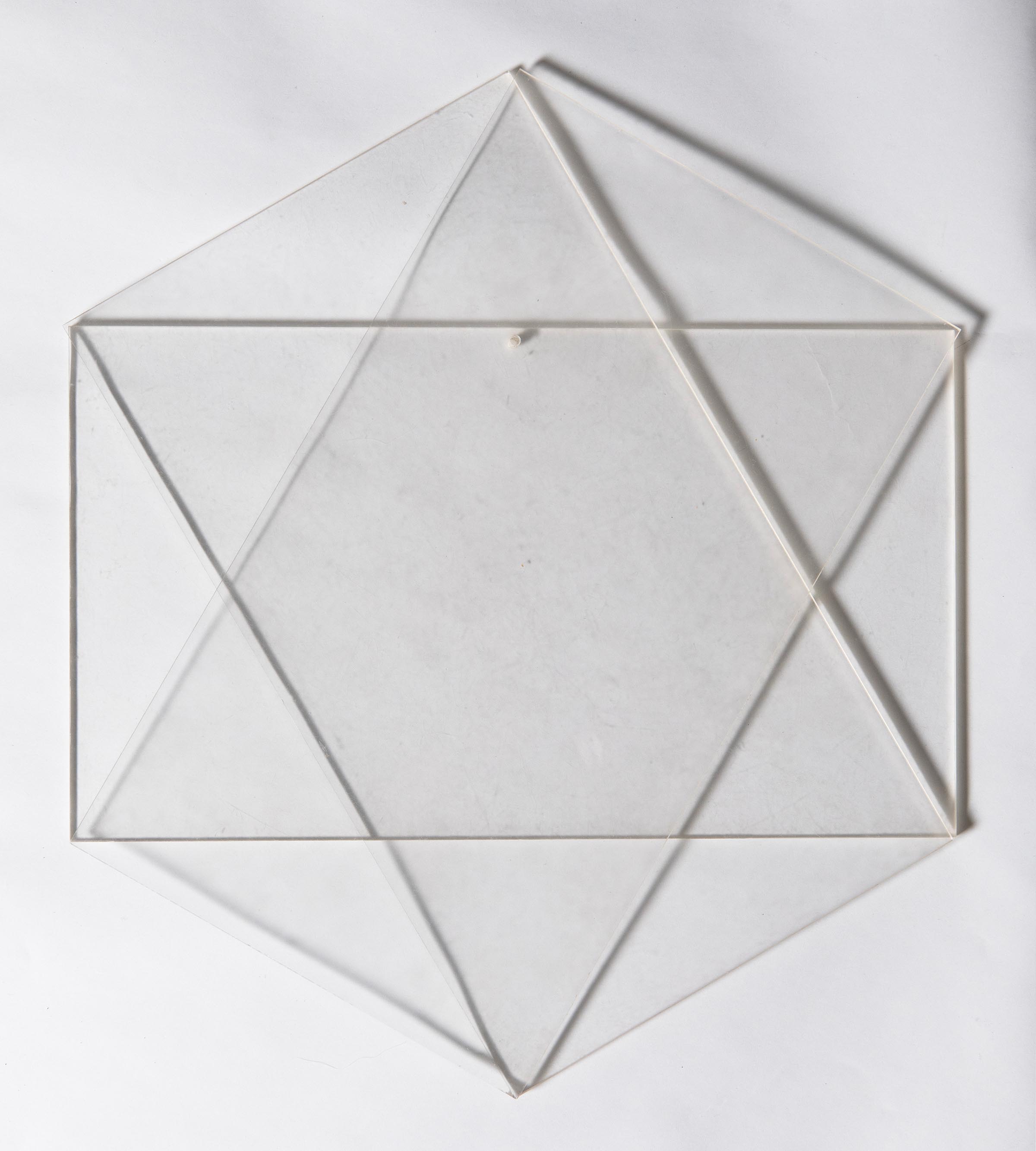 The act of achieving a perfect balance (“ex acto”) between three overlapping plexiglas sheets – each of which has a hole so that it can be hung from the same place on the wall – creates a hexagonal ("exact") figure.
