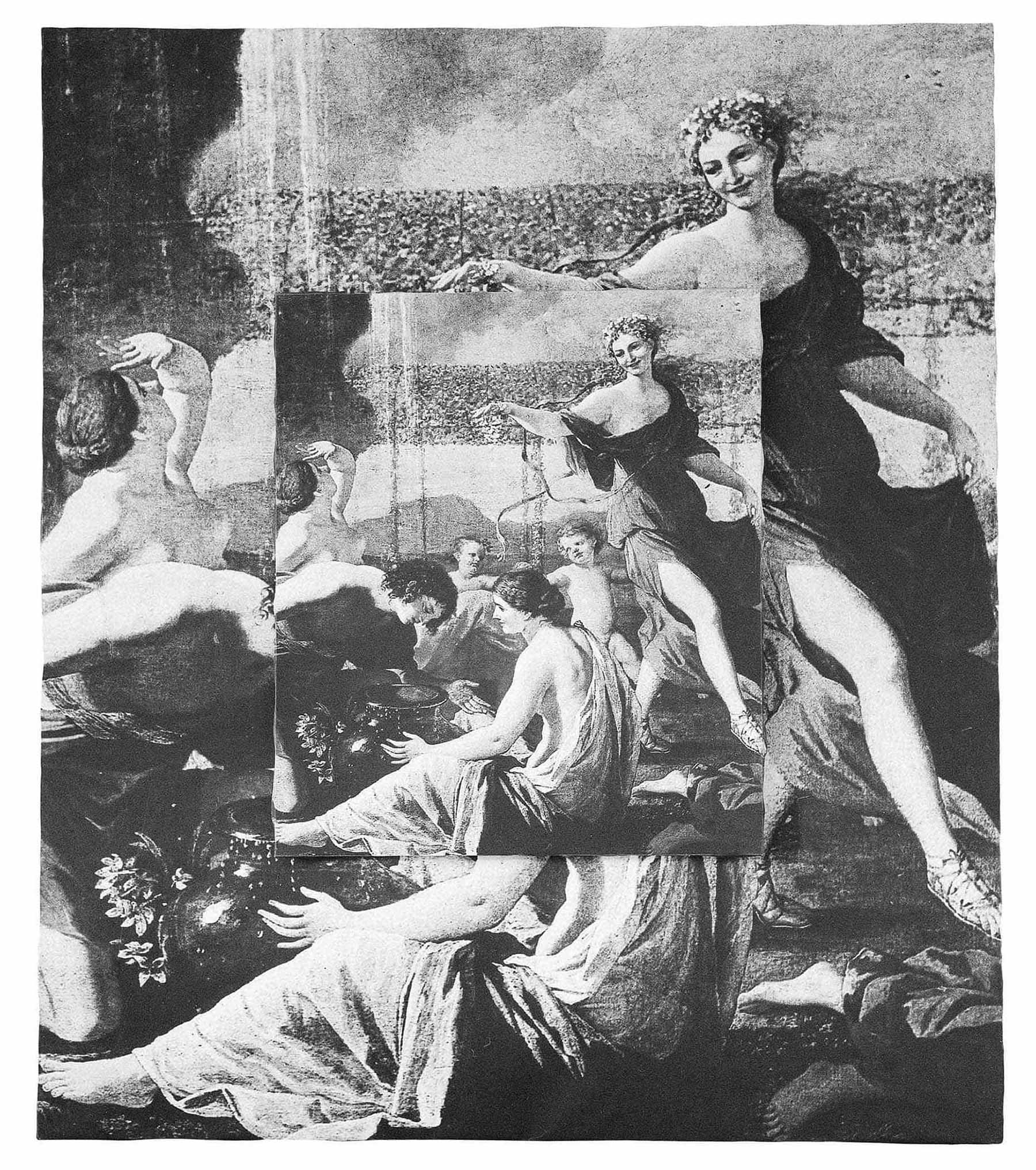 Dropping down at the centre of the photographic canvas, which reproduces the central detail of the painting L’Empire de Flore (ca. 1631) by Nicolas Poussin, is a smaller photographic canvas featuring the same subject.