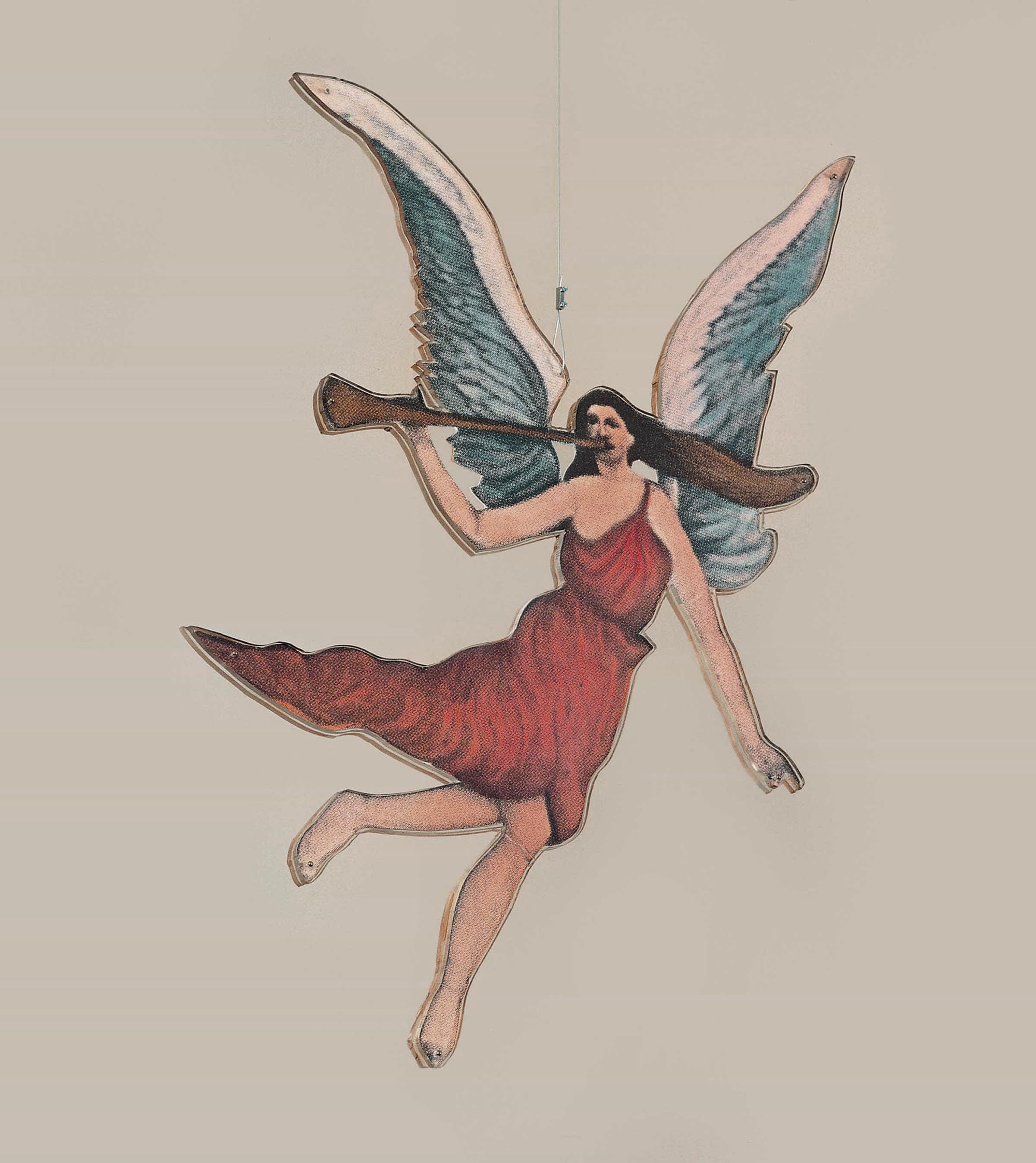 Two photographic blow-ups of the angel represented by Henri Rousseau in the painting La liberté invitant les artistes à prendre part à la 22ème exposition des artistes indépendants (1906) are coloured with aniline ink and mounted verso against verso between two plexiglas shapes. The images hang down from the ceiling on a nylon thread, so that the figure can twist freely in space, and spread its call.