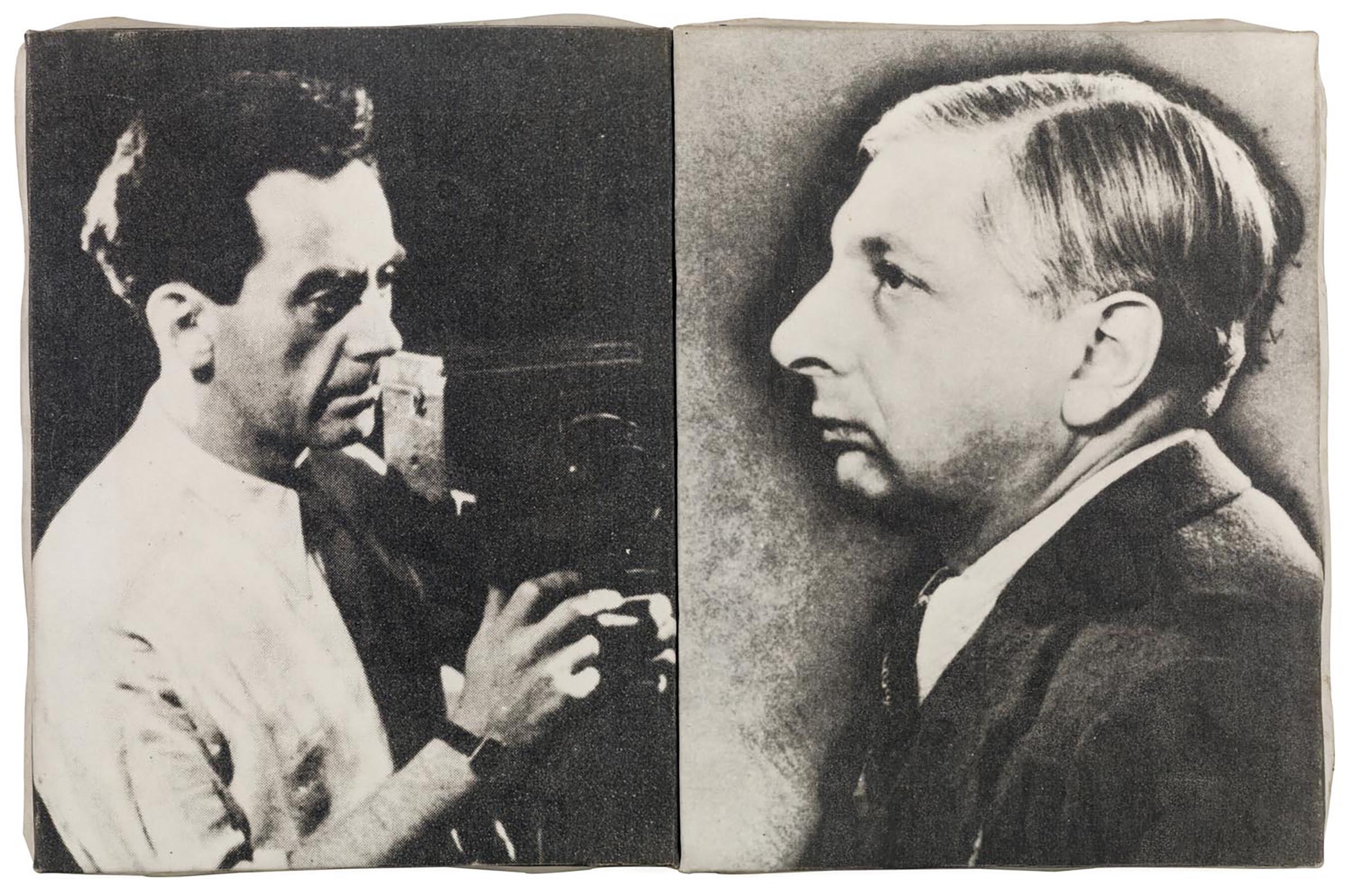 The two photographic canvases placed side by side reproduce a self-portrait of Man Ray, made in 1931, and a portrait of Giorgio de Chirico, taken by Man Ray himself in 1934. The vis-à-vis simulated by way of the two images, which are extraneous to each other, traces back over the instant of the actual "contact" that took place between the two artists at the time of Man Ray's portrait.