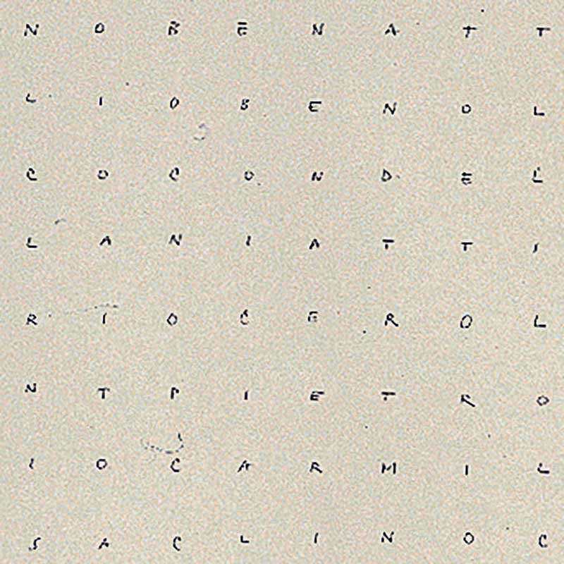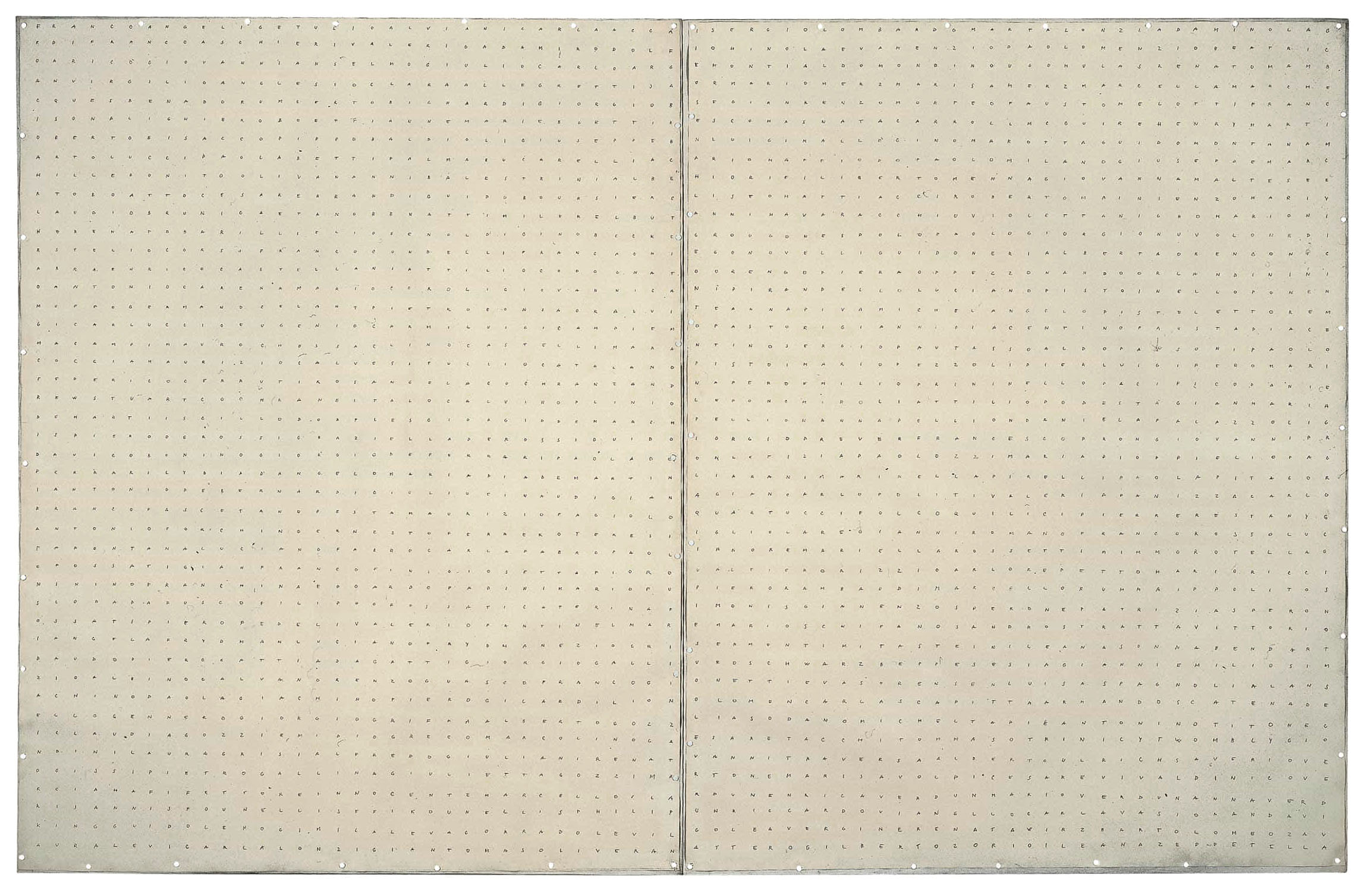 On two large sheets of blank paper, pinned to two primed canvases of the same size and placed together so that they resemble an open book, the artist wrote one by one – starting at the top left on the first sheet – the letters in the names of the people listed in alphabetical order in his notebook.1