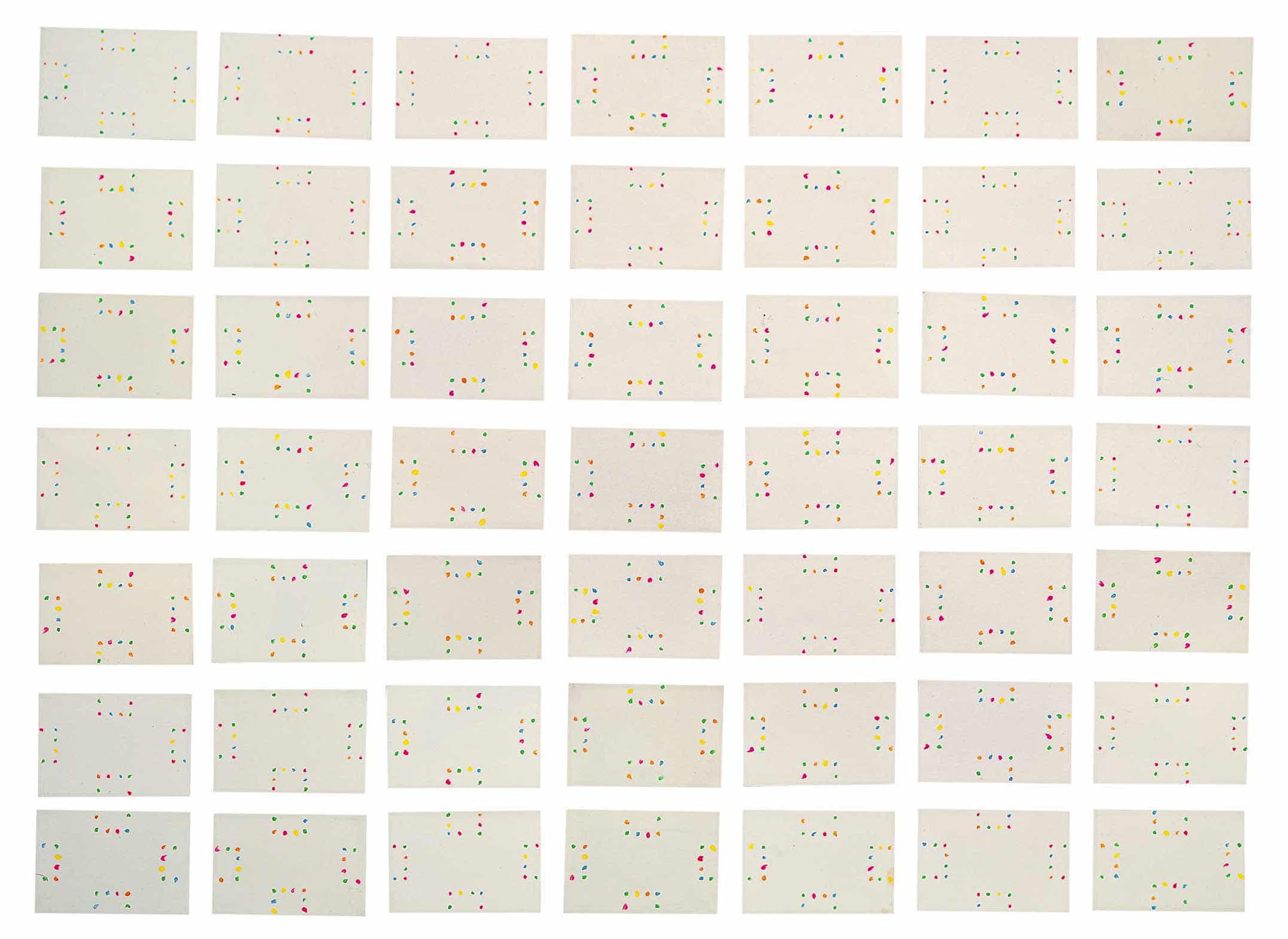 Forty-nine primed canvases each of which featuring, in the area corresponding to the median perimeter points, four semi-rectangles, determined by a tempera-painted multicolored dotted line. Overall, the semi-rectangles of a canvas correspond to those in the adjacent canvases, forming a multitude of what are presumed to be "paintings". The canvases appear to be “annulled” in their real presence, in favour of the countless and precarious images that take shape between them.