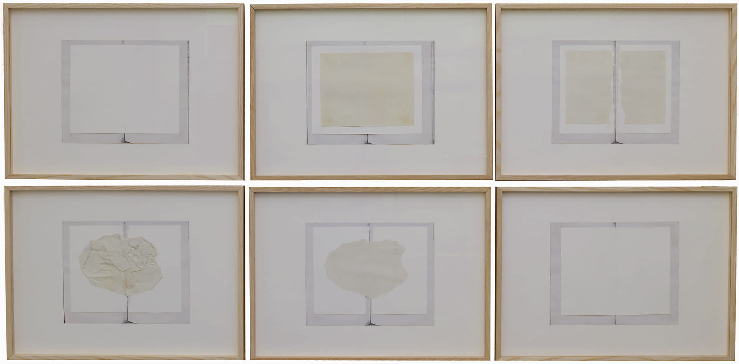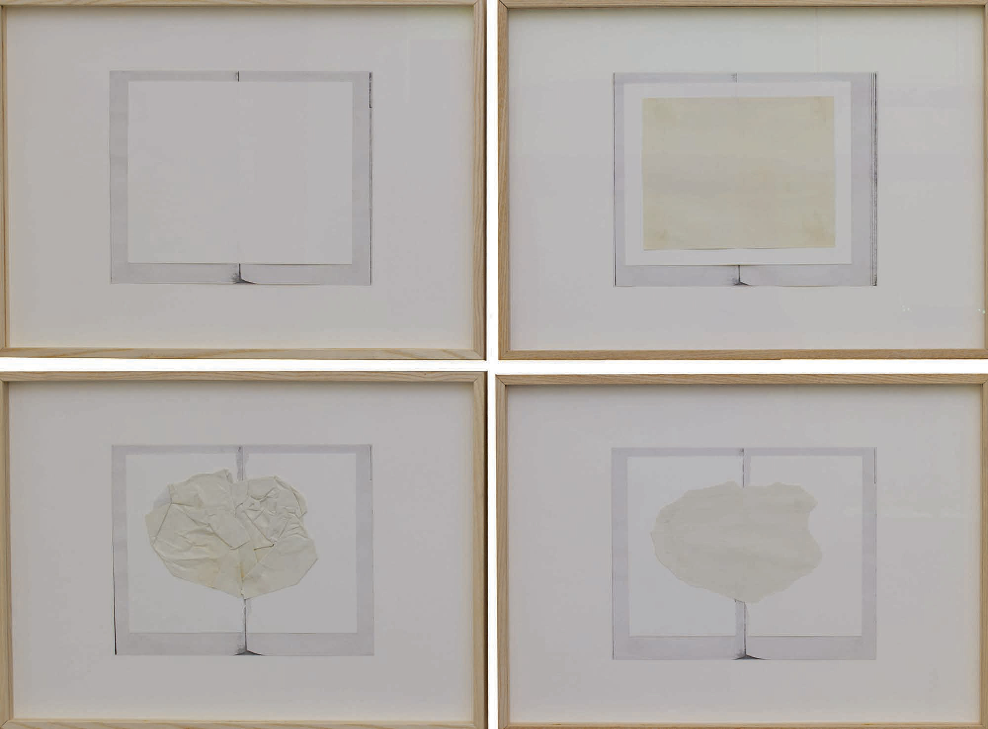 In the sequence made up of six elements, the reproductions of a book that is progressively opened to different pages are almost completely hidden by a collage, which leaves exposed only a frame surrounding it. In the first element, a blank sheet overlaps the image of the book; in the second element, the blank sheet is partially covered by a reproduction of two pages of the same book, which are seen from the back; in the third one, the same two sheets are torn along the median vertical axis; in the fourth one, the torn blank sheet hiding the image of the book is half-hidden by a crumpled sheet; in the fifth, a torn fragment applied to the torn sheet repeats the shape of the crumpled sheet in the previous element; lastly, the final element imitates the configuration of the first one, but with a different image of the book which in this case is open to the last pages.