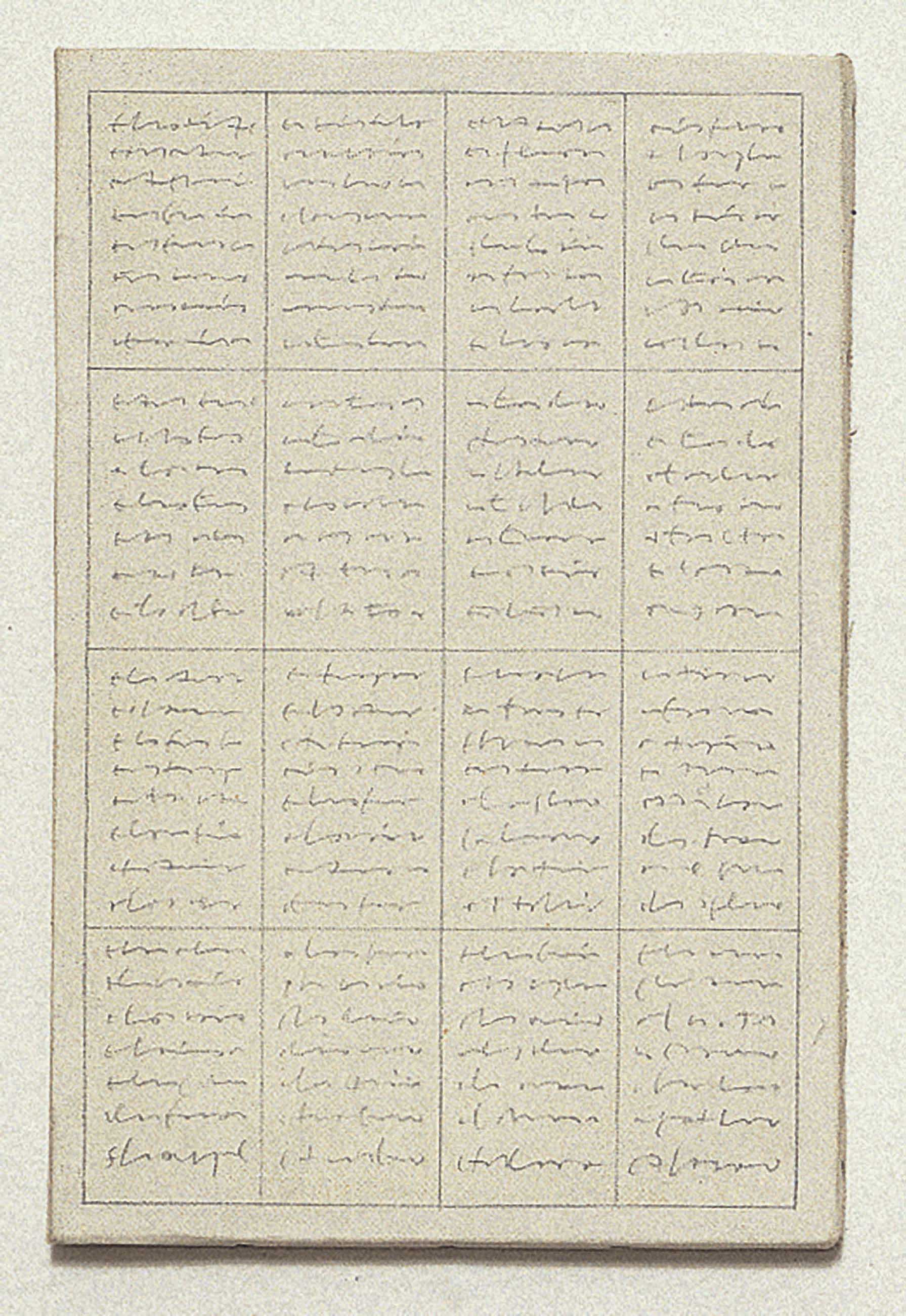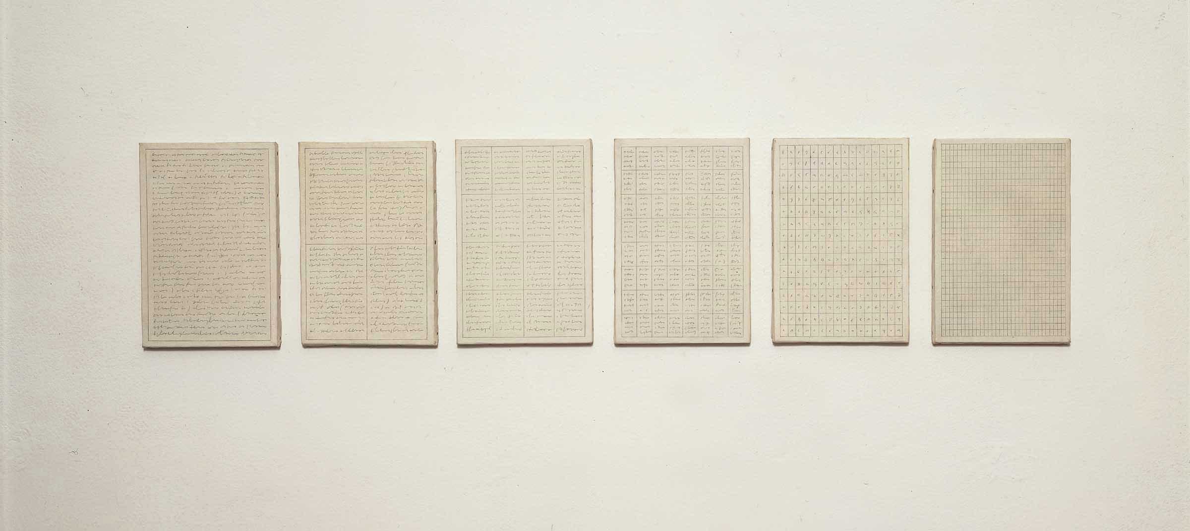 From one to the other of the six canvases, a progressive reticular subdivision has the upper hand over the automatic calligraphy – a hypothetical description of the work itself – until it entirely replaces the written image and appears as a drawing.