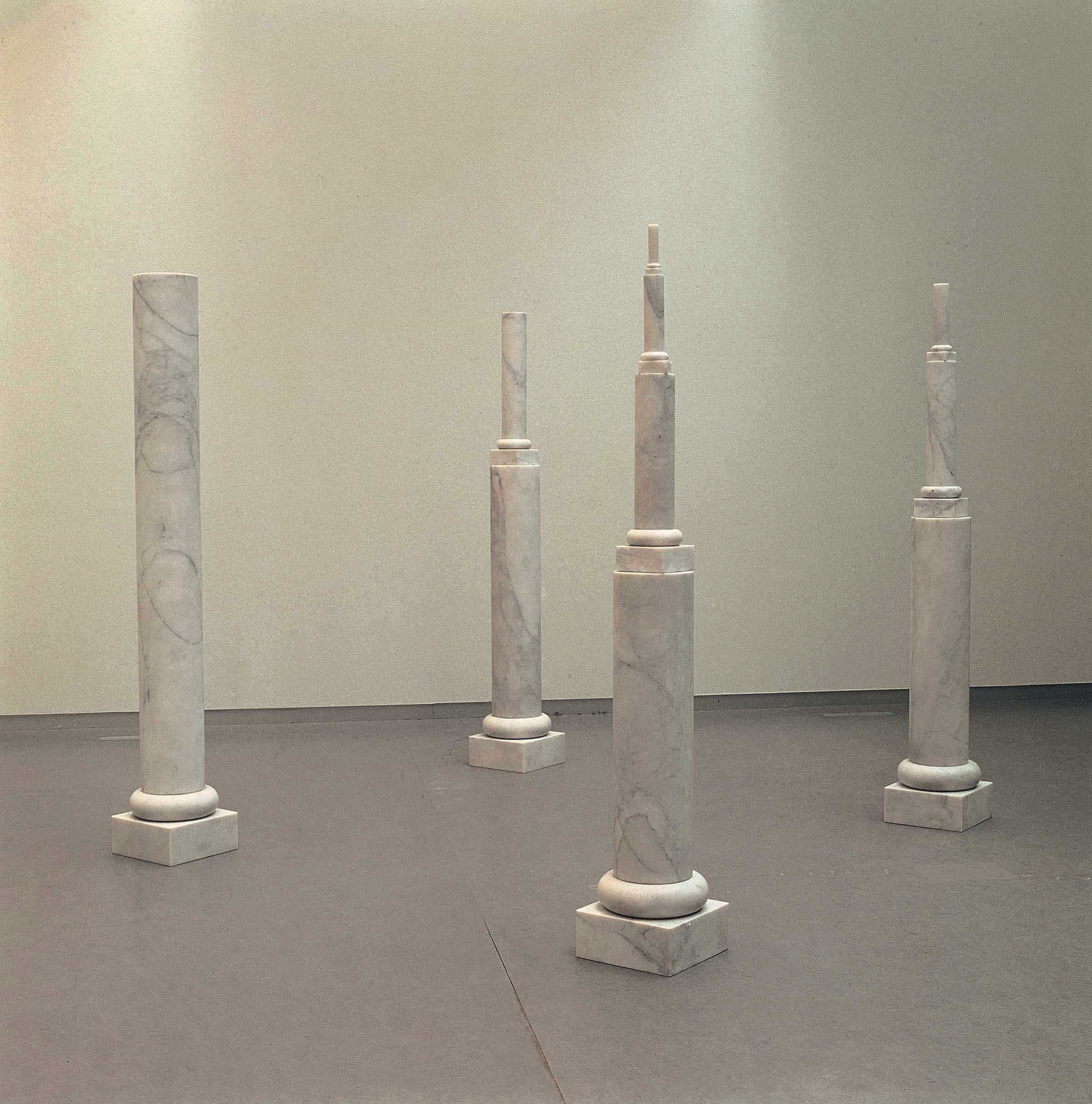 Four marble elements are arranged so that they are equidistant from each other, according to an oblique pattern with respect to the axes of the room. From one element to another the number of overlapping columns changes, going from one to four with a gradual reduction in their size as well – each column is equal in height to half of the column it supports – so that each of the four elements together achieves the same height.
