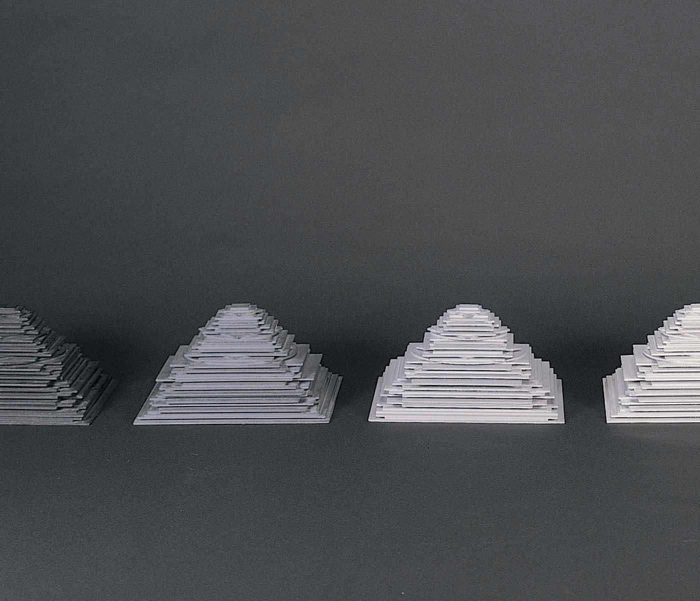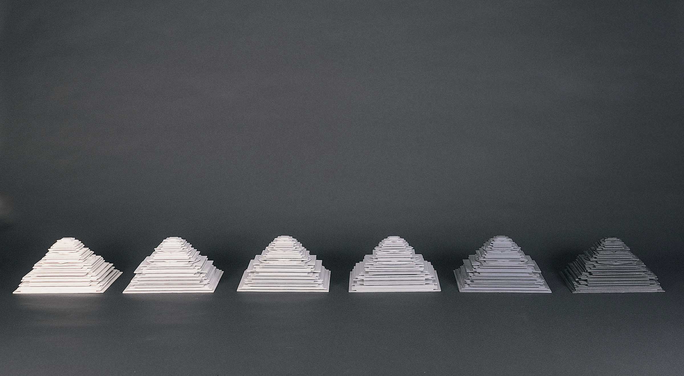 A large number of geometric shapes made of wood painted from white to black and piled up in order of decreasing size make up six monochrome pyramidal units.