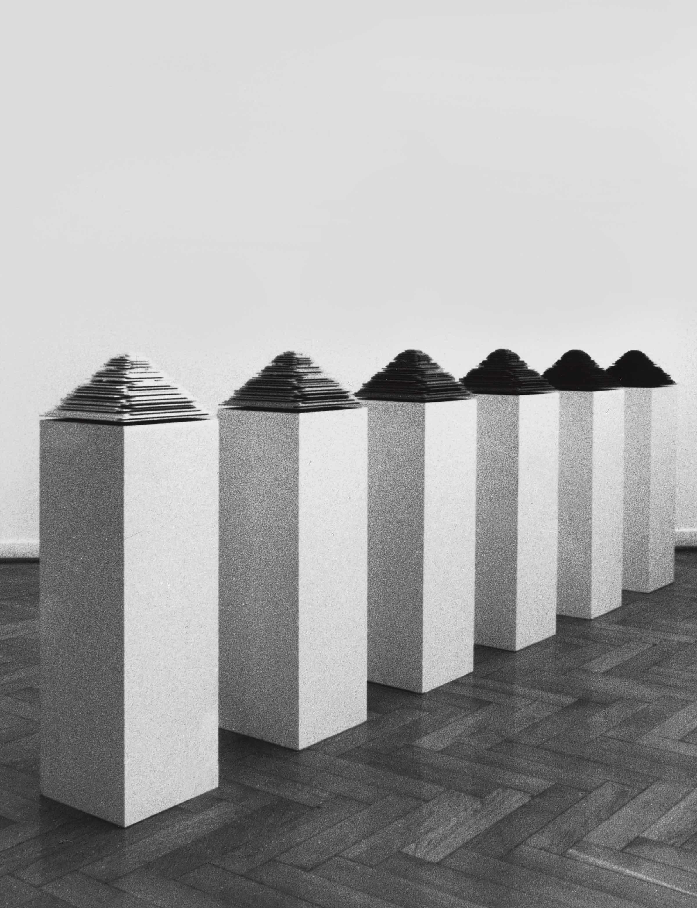 The installation of the work requires that each pyramid be set on a plinth, slightly elevated from the support surface by means of a piece of card stock or other stiff material. The six plinths must be lined up in a row, 30 cm apart, and the chromatic range of the pyramids should develop from white (on the first plinth) to black (on the last one).