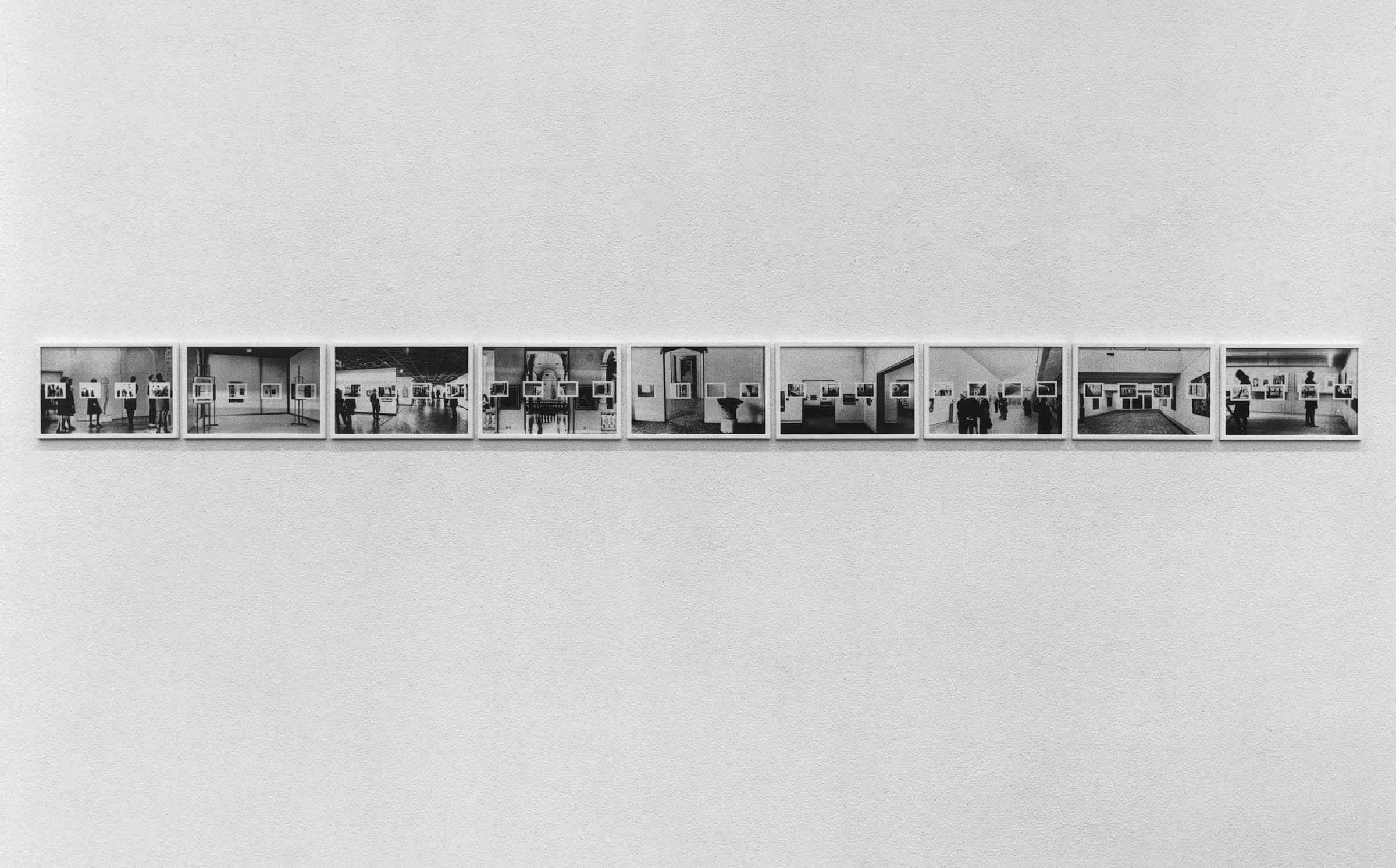 In each of the nine views of exhibition rooms at times occupied by viewers, four smaller photographs, located in the area corresponding to the median horizontal axis, "echo" some of the details of those same images or of other rooms in the same museum.