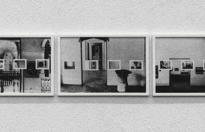 When looking at the sequence of photomontages placed close together the row of small images framed by a white border resembles a series of paintings at the viewer's eye level; in some cases they even resemble paintings displayed in those same spaces.