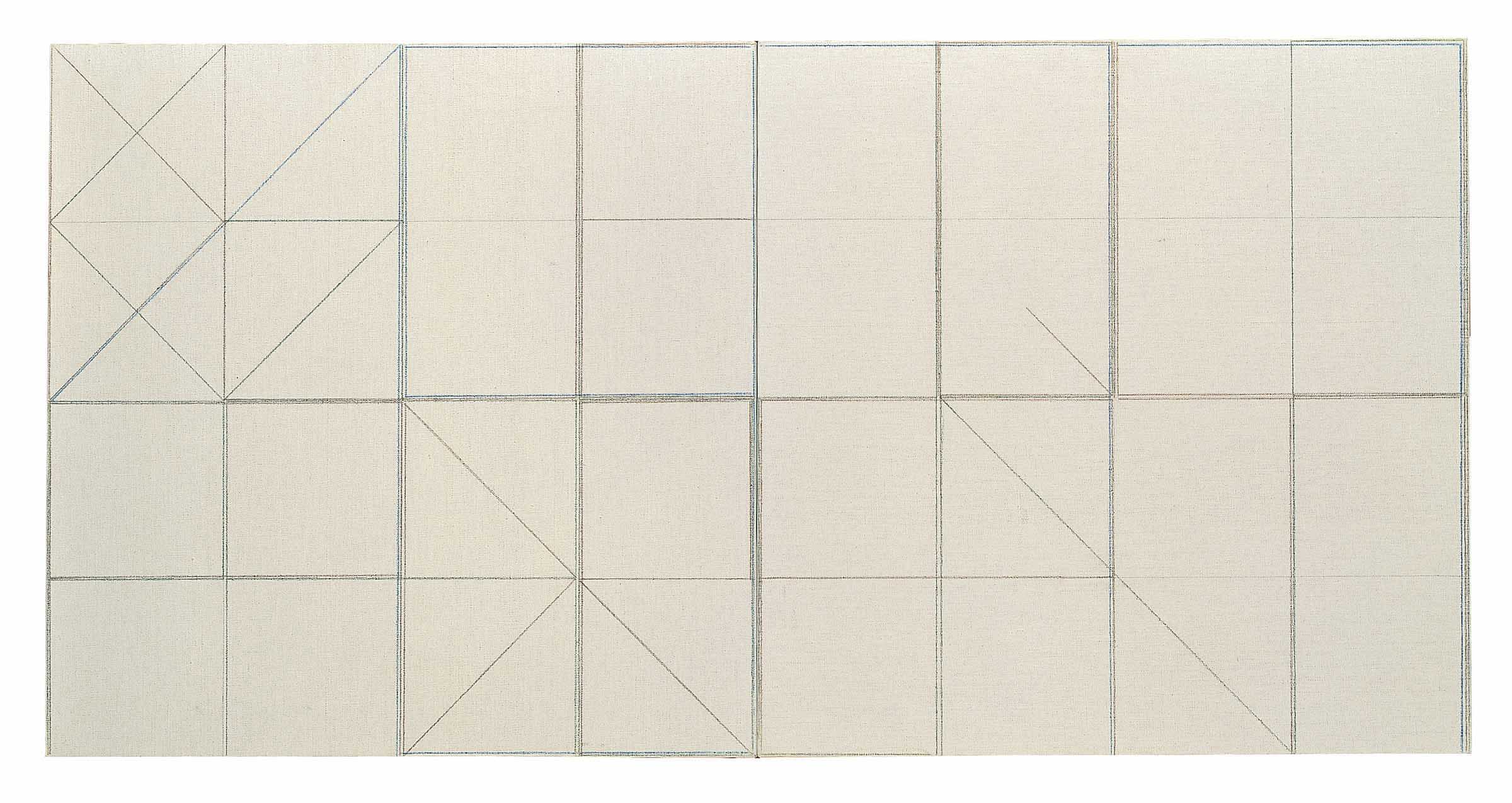 Two square canvases placed close together feature large squared lettering, outlined with coloured pencils, of the data that authenticates the work itself: “Giulio Paolini" (green), "Due quadrati" (gold), "1977" (blue).