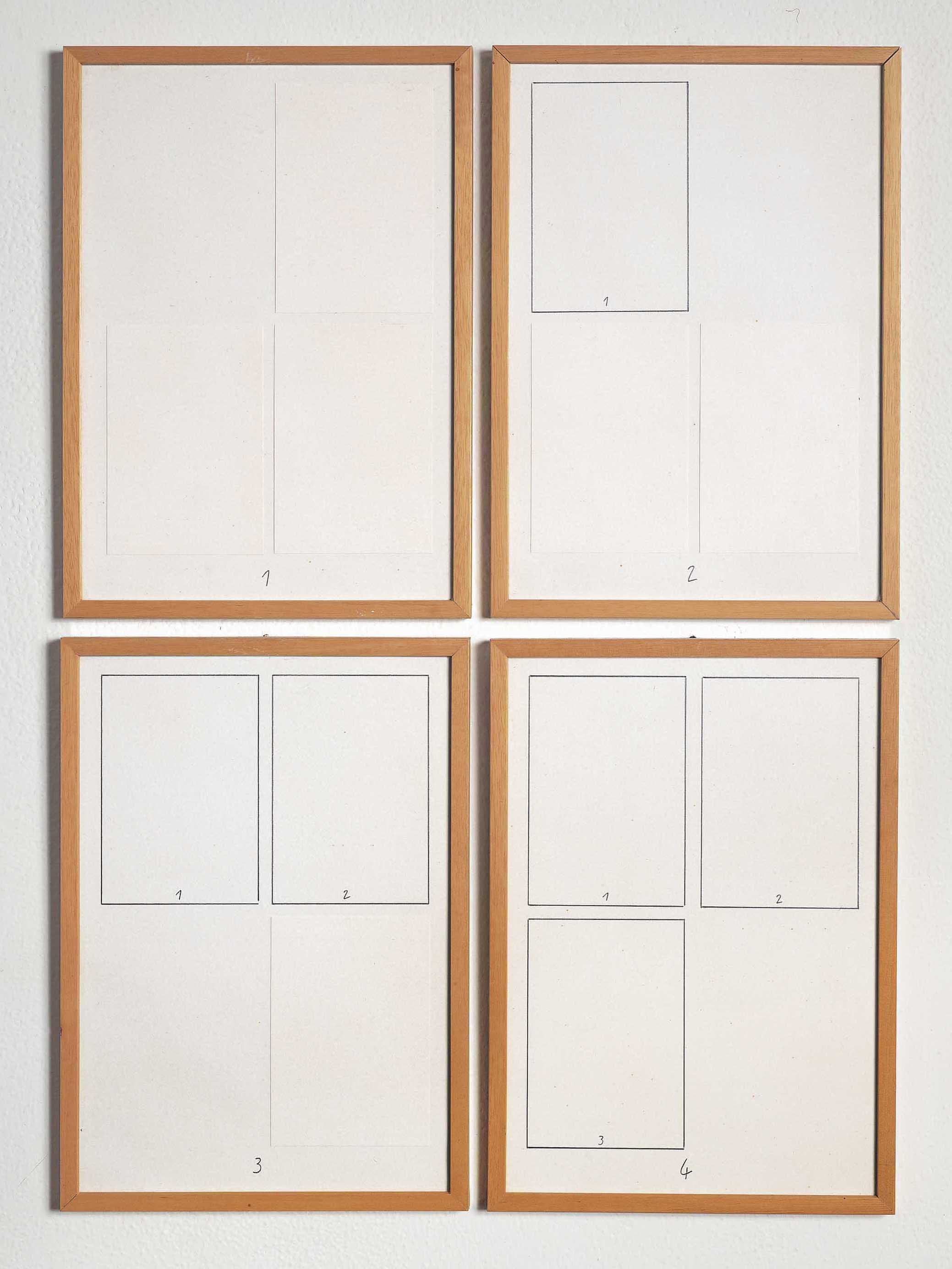 In each of the four sheets, starting from the first one at the top left, a collage of white modules foreshadows the elements that follow, while starting from the second element a pencil drawing reproduces the previous elements time after time.
