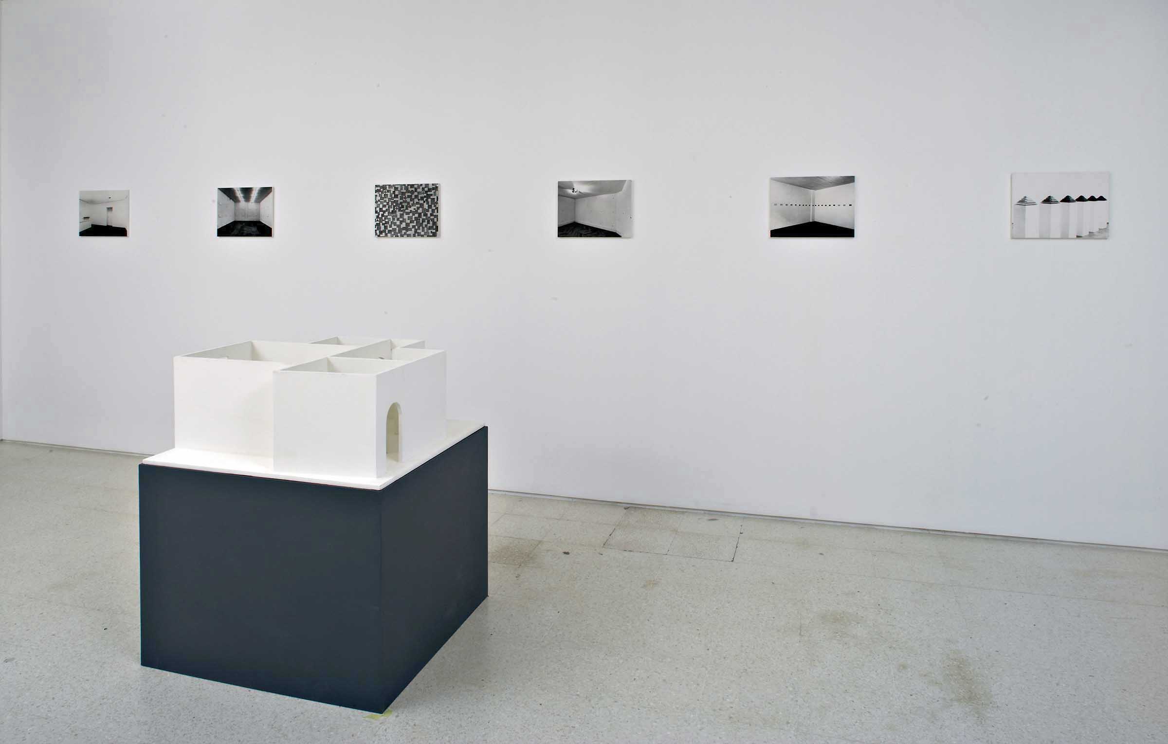 In a larger room and in the presence of other works, the six photographs must be aligned horizontally in a row on a single wall and equidistant from each other, in the correct sequence from the view of “Idem I” to that of “Idem VI”. The model must be set up on the plinth close to the wall with the photographs, at least 1 metre away, thus allowing for a person to walk around it.