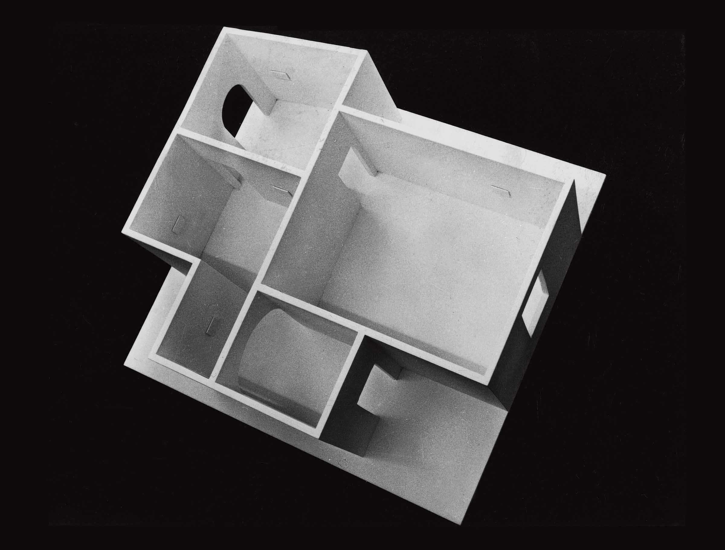 The version that completes the cycle entitled Idem, which was begun in 1972 (cf. GPO-0244, GPO-0245, GPO-0261, GPO-0265, GPO-0296, GPO-0335), is closely related to the venue of its first presentation, the Galleria Mario Diacono in Bologna. The six photographs document the previous versions of Idem,1 while the model, which reproduces the Diacono gallery, recalls the same images via six small white squares, mentioned in the title as "six theoretical images" (in the Bologna exhibition the model on display at the centre of the last room was a miniature version of the installation of the same exhibition).