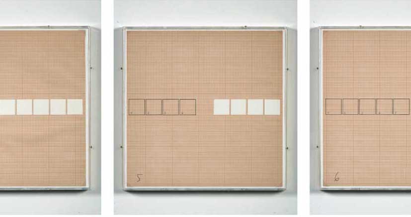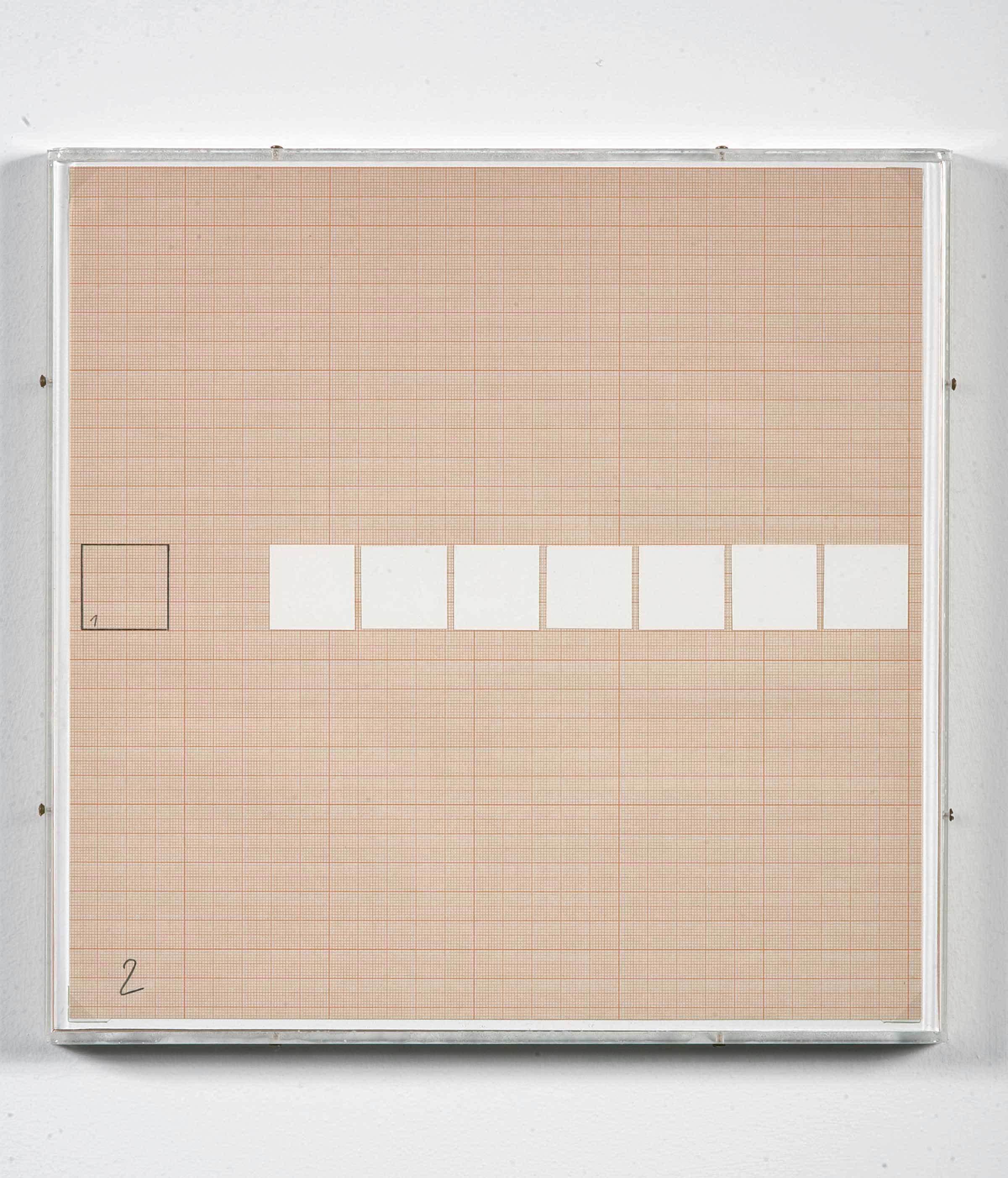 The nine elements aligned at short intervals to form a long horizontal sequence each propose, via two distinct progressions, the image of the components that follow or precede the element itself. The following elements are announced by way of white paper squares, applied on sheets of graph paper, while the ones "already seen" are recalled in pencil-drawn squares.
