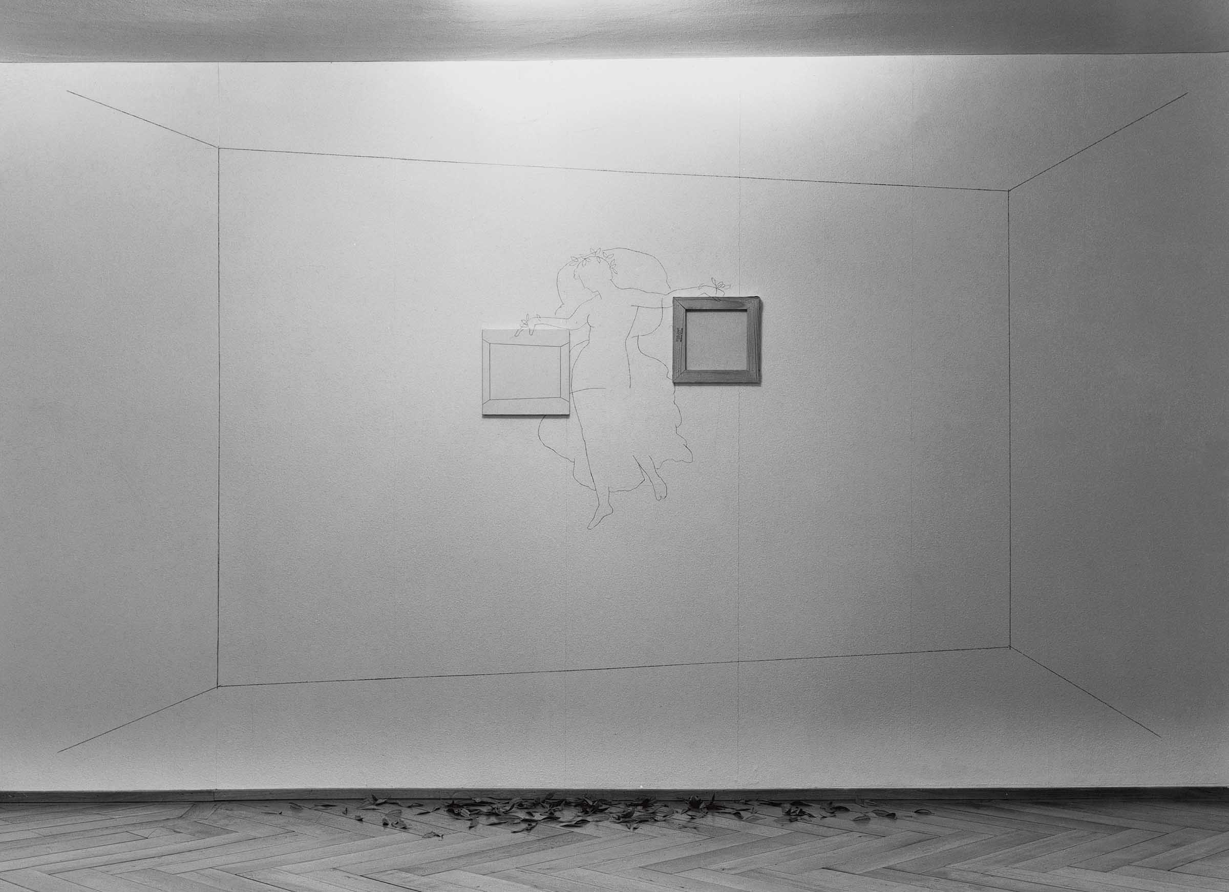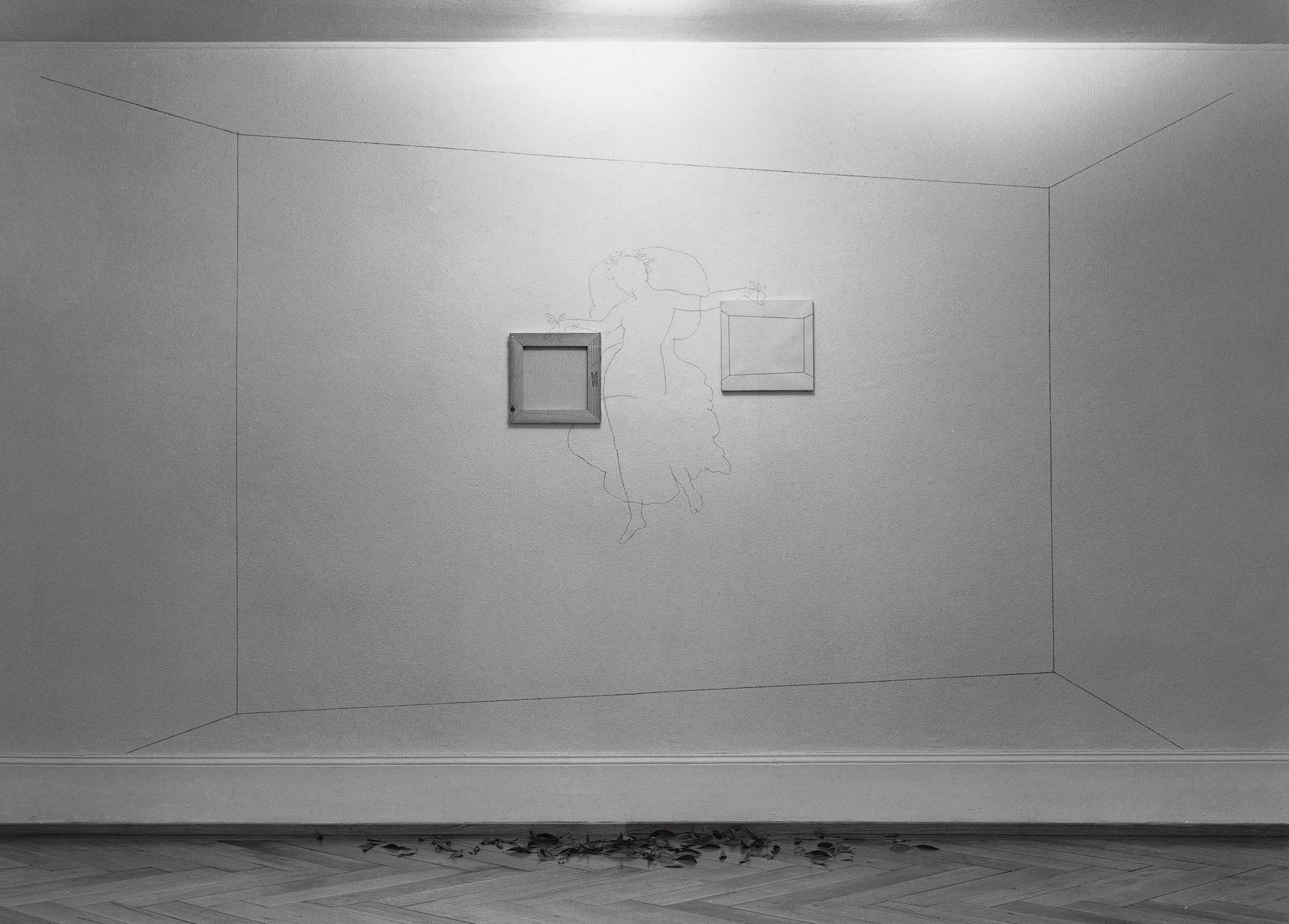 The work installed on two opposite walls of a room involves for each of them a perspectival drawing, which repeats the spatial framing of the wall and contains the profile of a female figure with a laurel leaf diadem. The figure is holding a pair of canvases, one viewed from the recto, the other from the verso, whose position is inverted in the passage from one wall to another (the drawing of the hands continues onto the canvas). The canvas viewed from the recto features the same spatial pattern as what is drawn on the wall, which at the same time alludes to the framing of the stretcher of the overturned canvas. The laurel leaves scattered on the floor before each wall echo the allegorical ones encircling the figure's head.
