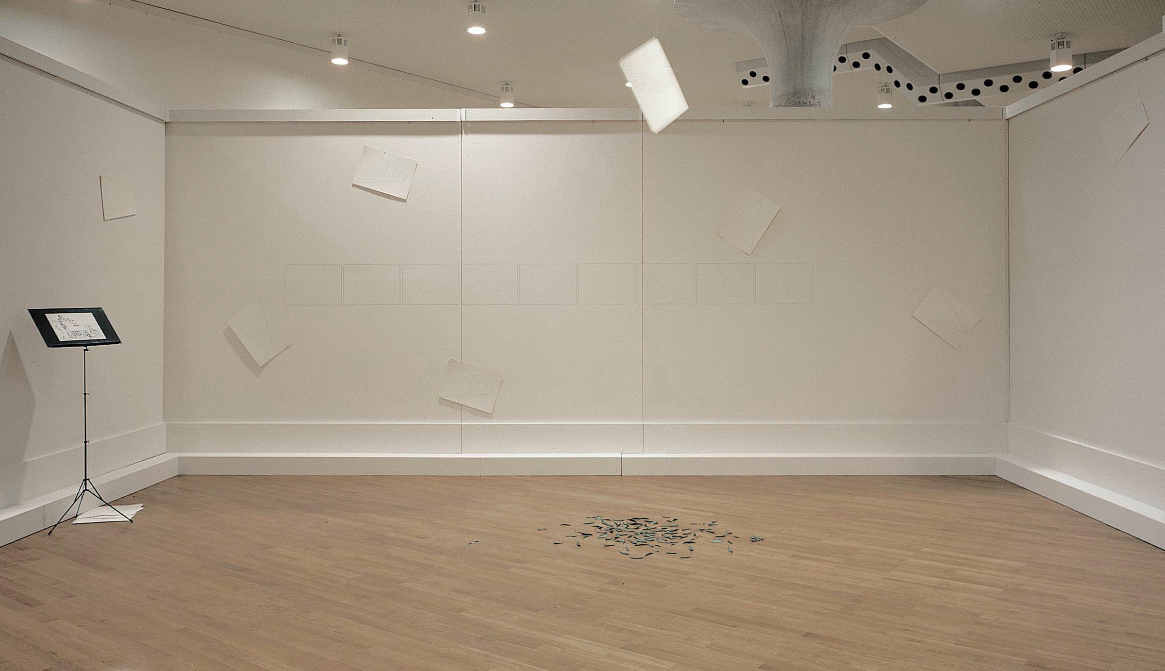 Pencil and red pencil on paper, music stand, collage on paper, bay leaves, pencil on wall