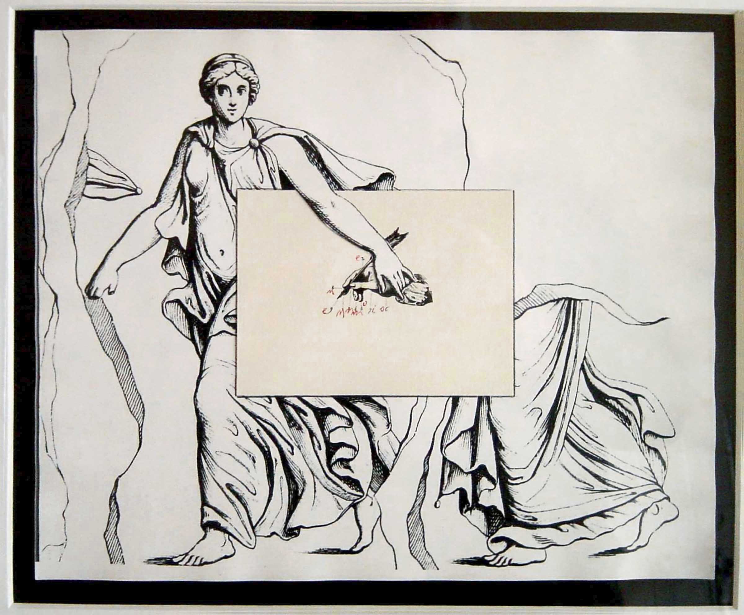 The collage arranged on a music stand and seen as a "title-page" or the announcement of a "story" developed over sheets arranged all around, is made up of the association of two antique drawings: two Muses and a didactic table with nine numbers illustrating the "real way to hold a pen" when writing. In the central part, written in red pencil once more are the nine letters of the name Mnemosine.