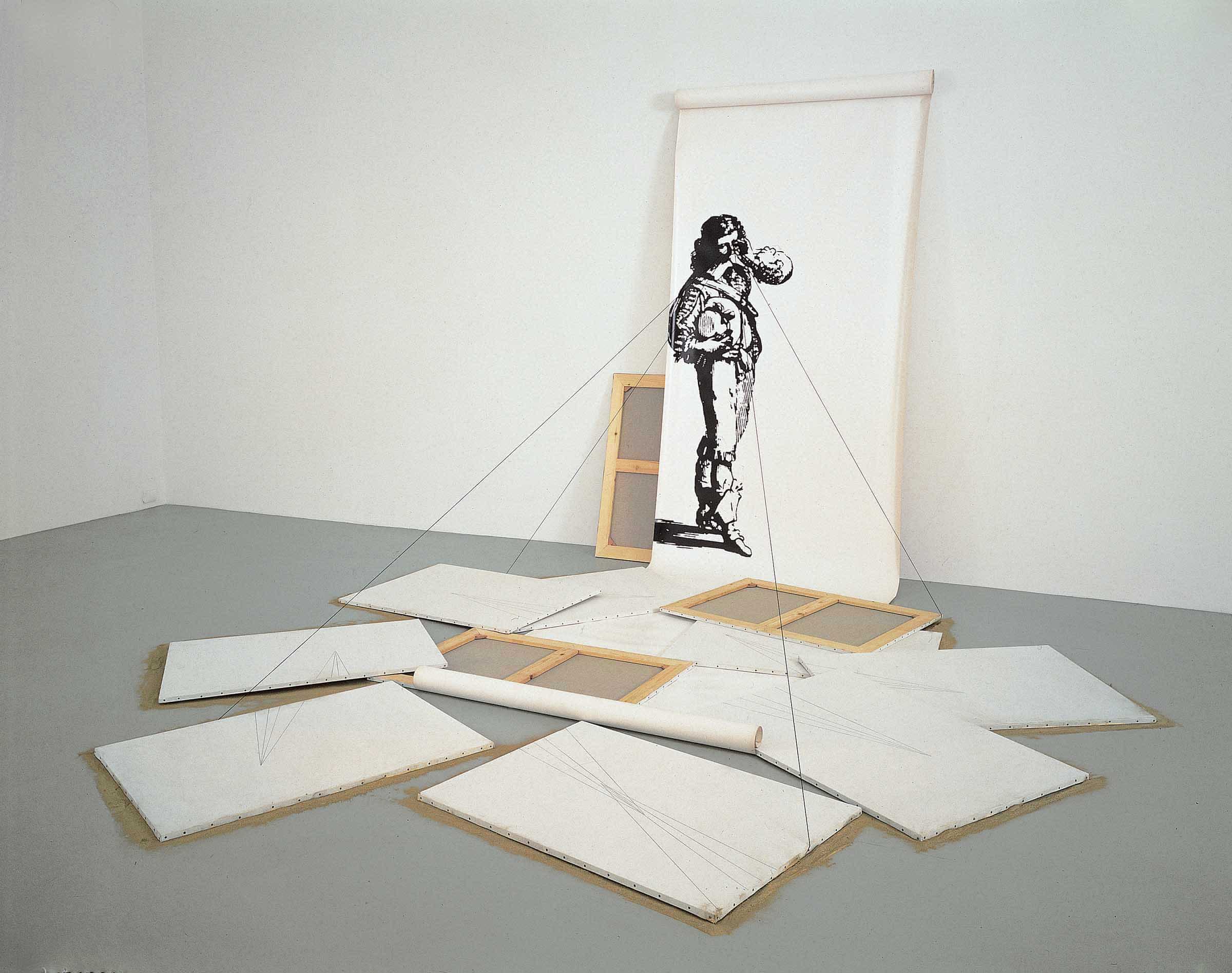 On a large sheet of photographic paper hanging from the wall and rolled out on the floor is the life-size reproduction of a male figure wearing a seventeenth-century costume.1 Departing from this beholder's eye are four black elastic threads, which circumscribe ten canvases scattered on the ground in a square area (two of them are reversed). On each of the canvases the artist has outlined a different drawing of visual beams. The group of canvases is surrounded by a subtle gold dust perimeter. An eleventh reversed canvas is propped up against the wall, half-hidden by the photograph.