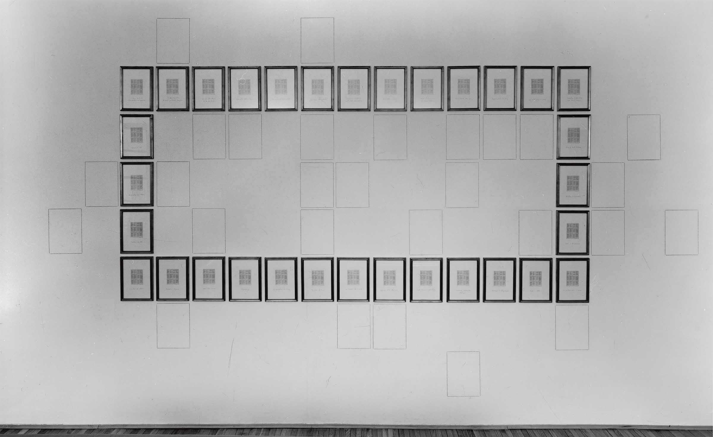 | 1982 | Kassel, Museum Fridericianum, Documenta 7, 19 June - 27 September, vol. 2, repr. p. 259 (detail); installation on two opposite walls: on the first one 16 elements in random order, on the other one 16 elements in the form of a frame, in both cases with rectangles drawn on the wall. |