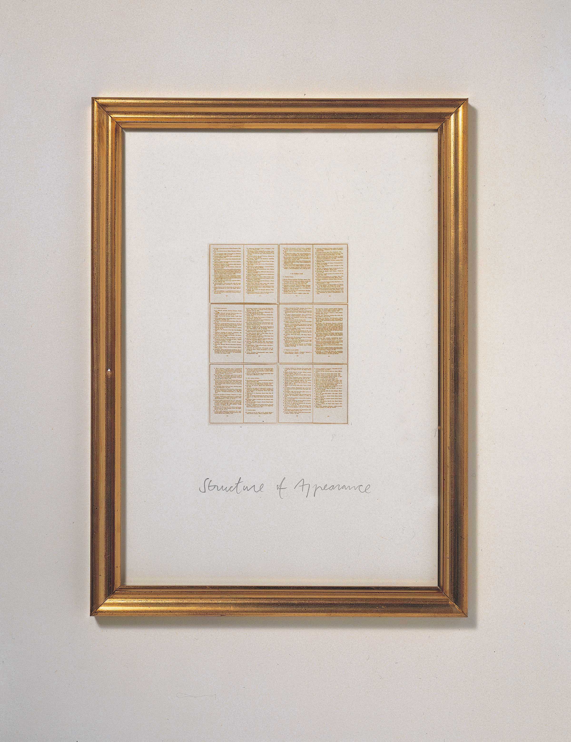 Del bello intelligibile is the general title of a cycle comprising five works, made between 1978 and 1982 (GPO-0401, GPO-0402, GPO-0403, GPO-0448, GPO-0467). Each work includes a specific number of lithographs printed in gold and placed in gilded frames, each of which repeats the same mosaic of minuscule reproductions, marked each time, however, by a different caption, written in pencil and referring each time to one of the small images that make it up, so that all together the inscriptions recompose the photographic mosaic in words. the reproductions and the number of framed prints change, according to the number of units that make up the mosaic.